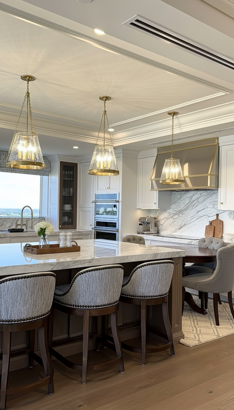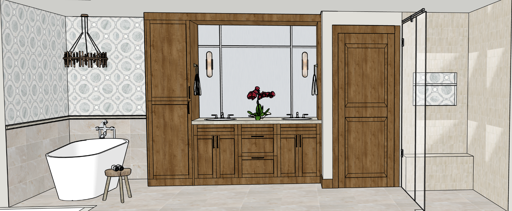 photorealistic interior render of a luxury primary bathroom with a warm refined spa like aesthetic no windows but space should feel bright airy and softly luminous through layered lighting and reflective surfaces overall style elevated mountain modern with european spa influence calm warm timeless and sophisticated cabinetry custom knotty alder cabinetry in a warm natural tone with visible grain and character knots slab style doors with simple recessed panel detail matte clear finish natural warmth without orange or red undertones vanity countertops double vanity with crema marfil marble countertops soft cream tone with subtle veining polished finish integrated undermount sinks plumbing hardware polished nickel faucets and fittings throughout clean and classic silhouettes with soft reflections tile surfaces main floor large format 24x48 porcelain tile in a warm light neutral stone tone minimal grout lines shower walls 2x6 ceramic tile installed in a clean straight stack pattern light cream tone shower niche new ravenna baby venus mosaic tile recessed and set back slightly for depth used as a refined accent moment far left accent wall decorative mosaic tile as shown reference image used as a feature wall behind the tub shower frameless glass shower enclosure with minimal hardware bench integrated in matching wall tile shower niche highlighted with accent mosaic tub area freestanding sculptural soaking tub positioned in front of the accent tile wall polished nickel tub filler soft ambient lighting to highlight textures lighting bright but warm lighting scheme to compensate for lack of windows soft recessed ceiling lighting with warm temperature 3000k decorative sconces flanking mirrors for glow and balance subtle under cabinet and toe kick lighting for depth and warmth no harsh shadows even illumination throughout the room mirrors large mirrors above vanity with integrated vertical sconces subtle reflectivity to enhance brightness mood atmosphere light filled serene and inviting despite no natural light emphasis on material richness texture and softness calm spa energy high end residential client ready presentation camera composition straight on elevation view showing tub vanity and shower together balanced composition realistic scale true to life materials no dramatic distortion rendering quality ultra realistic materials accurate reflections soft shadows high detail editorial level realism suitable for client presentation
