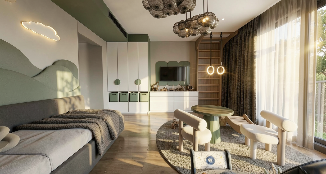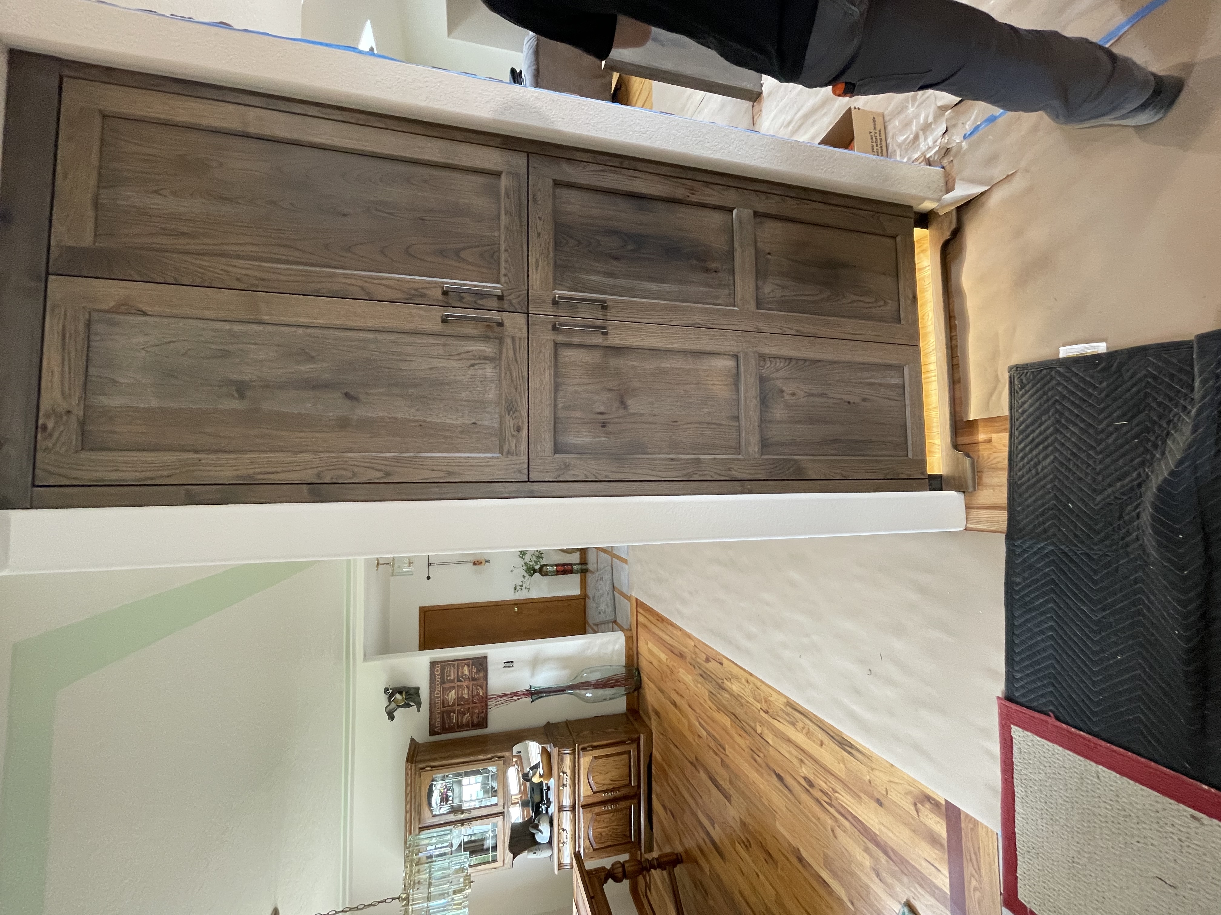do not change the cabinets in any way preserve the exact cabinet colors materials finishes dimensions door and drawer styles hardware spacing alignment and all geometry exactly as shown do not alter the countertop shape backsplash appliances flooring lighting fixtures or wall structure only remove the construction materials clutter and mess from the scene clean the room and make it look finished and staged add a few simple tasteful home accessories appropriate for the style of the space but do not add or remove any furniture windows or architectural elements maintain the original lighting direction and realism enhance clarity and polish the photo while keeping the cabinetry and room design completely unchanged do not alter the lighting to keep the cabinet colors as they are in the image add all new flooring change the background on the left to a cozy greatr oom