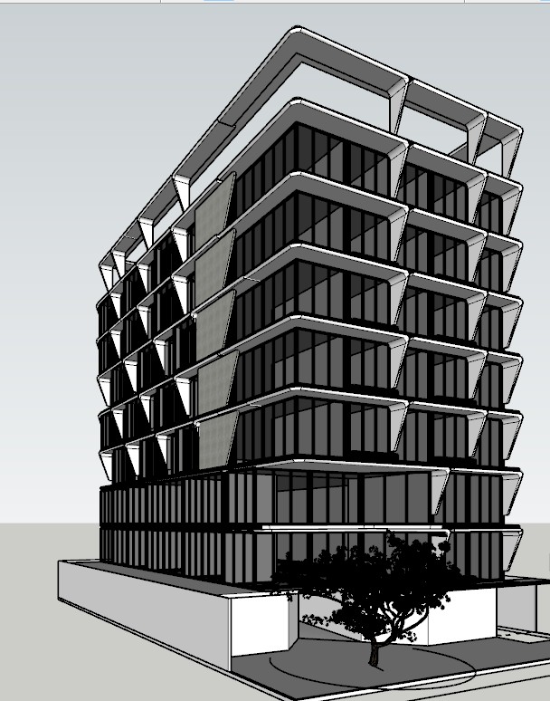 render a modernist architectural building with sleek angular lines use a palette of light gray for the concrete deep charcoal for the window frames and reflective glass the building should stand in an urban landscape with a clear blue sky and warm sunlight to create a bright and inviting atmosphere add subtle shadows for depth and dimension highlighting the building s geometric design