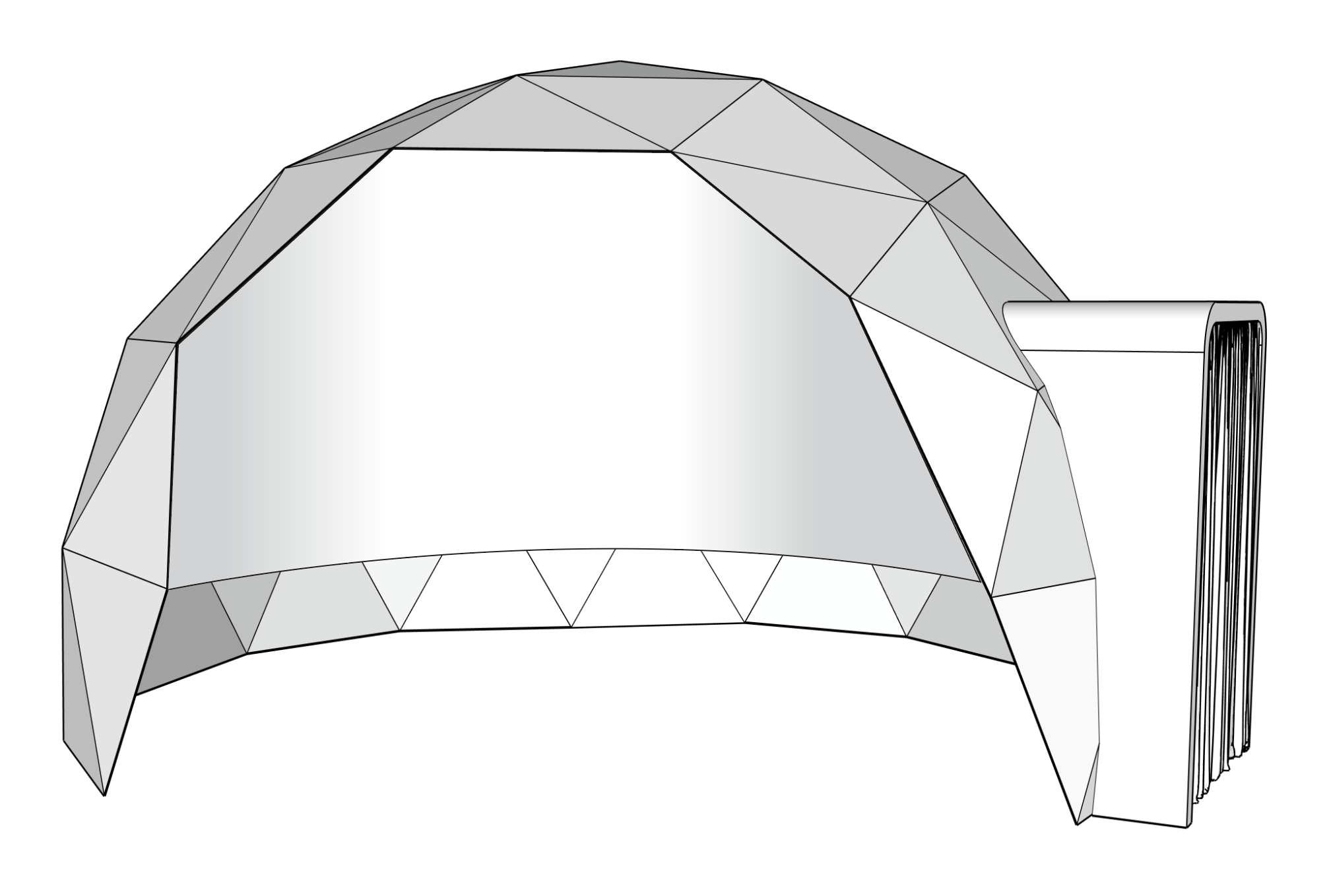 modernist exterior shot keep everything white this is a geometric dome with part of the wall cut away and a white screen on the interior architecture