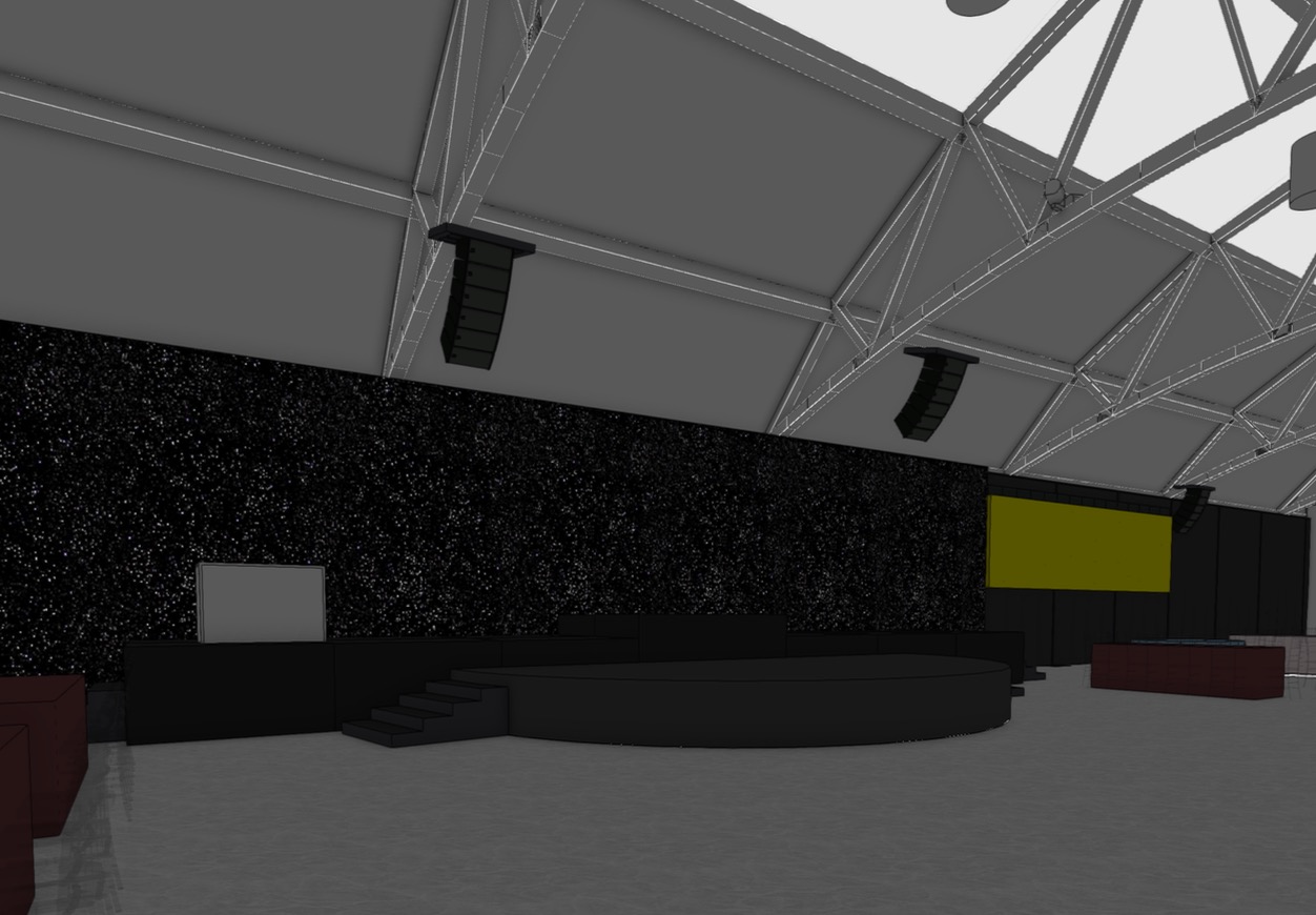 a modern event stage inside a large industrial venue with exposed white steel trusses and high ceilings the stage features a black circular platform with steps and a sleek matte black finish behind the stage is a large led star curtain backdrop creating a deep starry night sky effect with thousands of small white lights on black fabric three presenters are standing on stage dressed in formal attire positioned naturally as if hosting a live event to the right of the stage a large rectangular screen displays the fundraising total 1 234 567 in bold clean typography the atmosphere is enhanced with ambient yellow lighting and a soft smoky haze creating a cinematic high end gala environment subtle beams of warm yellow light cut through the haze adding depth and drama wide angle view realistic rendering high contrast lighting cinematic mood ultra detailed professional event production design