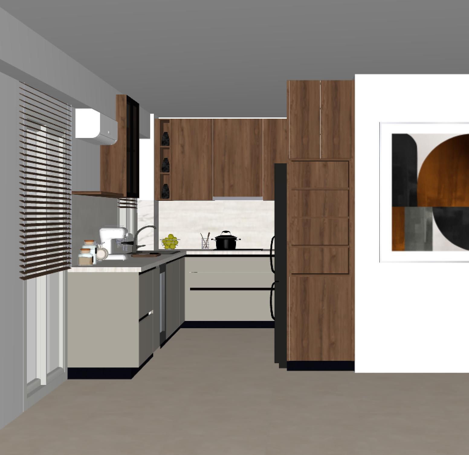 a modern kitchen with a warm and inviting atmosphere the cabinets are rich walnut wood creating a cozy yet sophisticated vibe the walls are a soft gray complementing the sleek beige countertops and stainless steel appliances the blinds are a natural wood tone adding texture and warmth the floor is a polished concrete in a light taupe shade add a touch of elegance with an abstract art piece featuring a mix of black white and burnt sienna shapes soft lighting creates a calm serene ambiance perfect for a contemporary stylish space