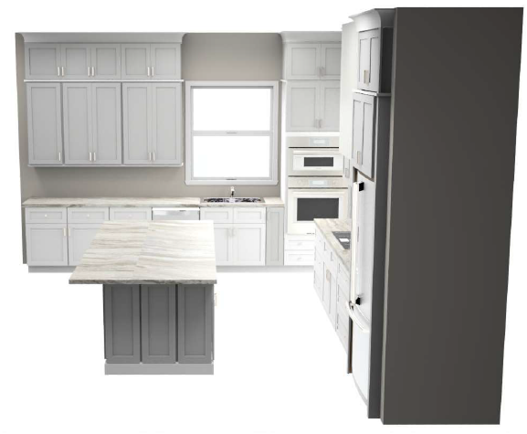 maintain the exact kitchen layout cabinetry style and all architectural elements do not alter the design proportions or placement of any components only update finishes and materials flooring apply happy floors tierra castanho 10706 c throughout the kitchen floor the tile should read as a warm earthy medium brown tone with subtle natural variation and a matte finish cabinetry base cabinets rugby cabinetry in kodiak stain rich warm wood tone with visible grain upper cabinets tall cabinets and hood rugby sand painted finish soft warm neutral light creamy beige tone not gray or stark white maintain existing cabinet door style and layout hardware apply champagne bronze finish hardware throughout use pulls on all doors and drawers finish should read as a soft warm metallic countertops apply cambria ironsbridge quartz countertops with a polished finish surface should have a soft white cream base with subtle warm veining in beige and taupe tones backsplash full height extend the cambria ironsbridge countertop material as a full height backsplash run continuously from the countertop surface up to the bottom of upper cabinets and hood at the range wall carry the material full height behind the hood for a seamless slab look no 4 backsplash anywhere minimize seams and maintain a clean continuous appearance lighting color accuracy use bright neutral lighting to ensure all finishes read true to color no yellowing graying or color distortion preservation do not modify appliances plumbing fixtures or overall layout preserve all existing elements exactly as shown aside from the specified finish updates