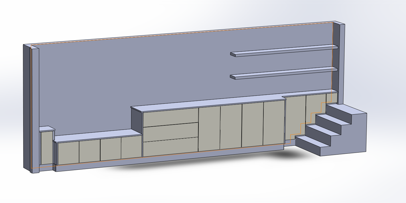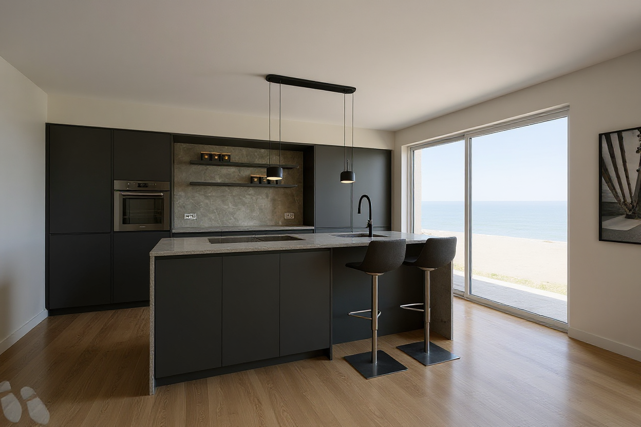 interior shot light grey kitchen with marble counter top oak floor and steps and an off white wall