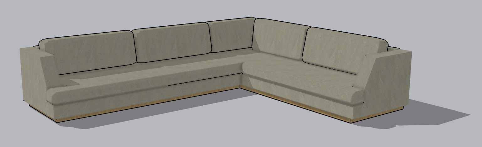 photorealistic interior product rendering of a custom l shaped sectional sofa maintain the exact geometry proportions and camera angle of the original model do not alter the design enhance material realism upholstery is a soft creamy off white fabric with subtle boucle or textured weave add natural fabric variation slight tonal inconsistencies and realistic stitching details cushions should have gentle compression soft edges and slight irregularity not perfectly sharp improve lighting use soft diffused natural daylight from one side add subtle ambient bounce light and realistic contact shadows beneath and behind the sofa avoid harsh or overly bright lighting enhance details add slight fabric wrinkling and tension at edges and seams introduce realistic depth in seat cushions and back cushions wood plinth base should have natural wood grain warm tone and slight variation rendering style high end editorial furniture photography neutral warm color balance not cool or blue soft depth of field very subtle background slightly blurred clean minimal background with a soft shadow grounding the sofa strict instructions do not change the shape proportions or layout do not add or remove elements do not redesign the sofa only improve realism materials and lighting