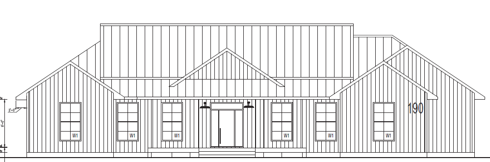 black steel roof vertical white siding on bumpouts horizontal light grey siding under veranda white trim black craftsman entry door no dormers