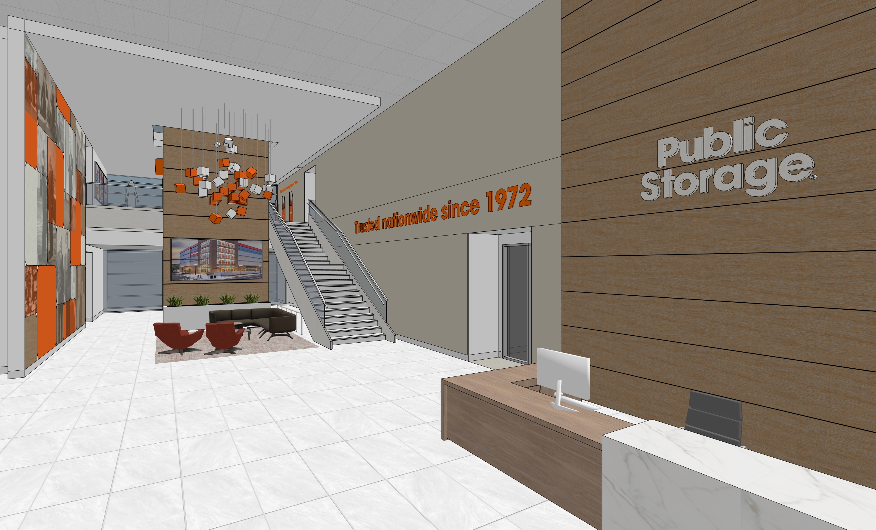 photorealistic interior polished tile floors white walls and light metal orange accents left wall painted soft light beige color that wraps up onto the ceiling as accent text on white wall on the right is orange acrylic letters boxes floating in the ceiling in the middle are soft dim light soft glowing there s wood accents on the middle tower the space is lit up with soft ceiling soft lights bright lighting and overall environment is soft bright lighting edge of orange color on left wall and ceiling is glowing soft