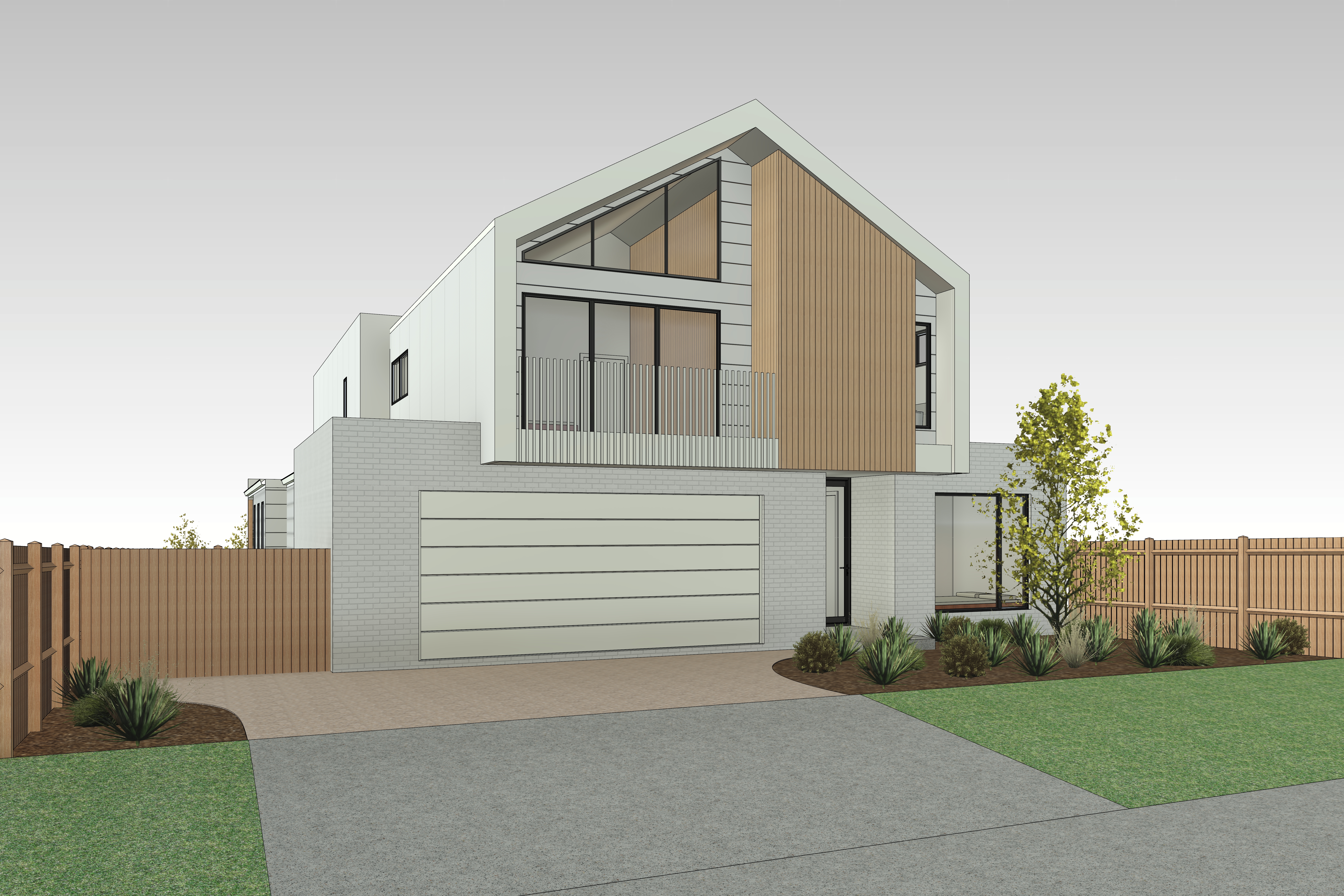 a modern two story house with a minimalist design set against a bright clear sky the structure features a sleek white facade accented by warm natural wood panels on the upper level large black framed windows bring a contemporary touch a neatly maintained lawn with rich green grass surrounds the area bordered by a light brown wooden fence the smooth gray concrete driveway leads to a spacious garage lush landscaping includes green shrubs and a small vibrant tree adding life to the scene the atmosphere is calm and inviting blending modern architecture with nature s tranquility
