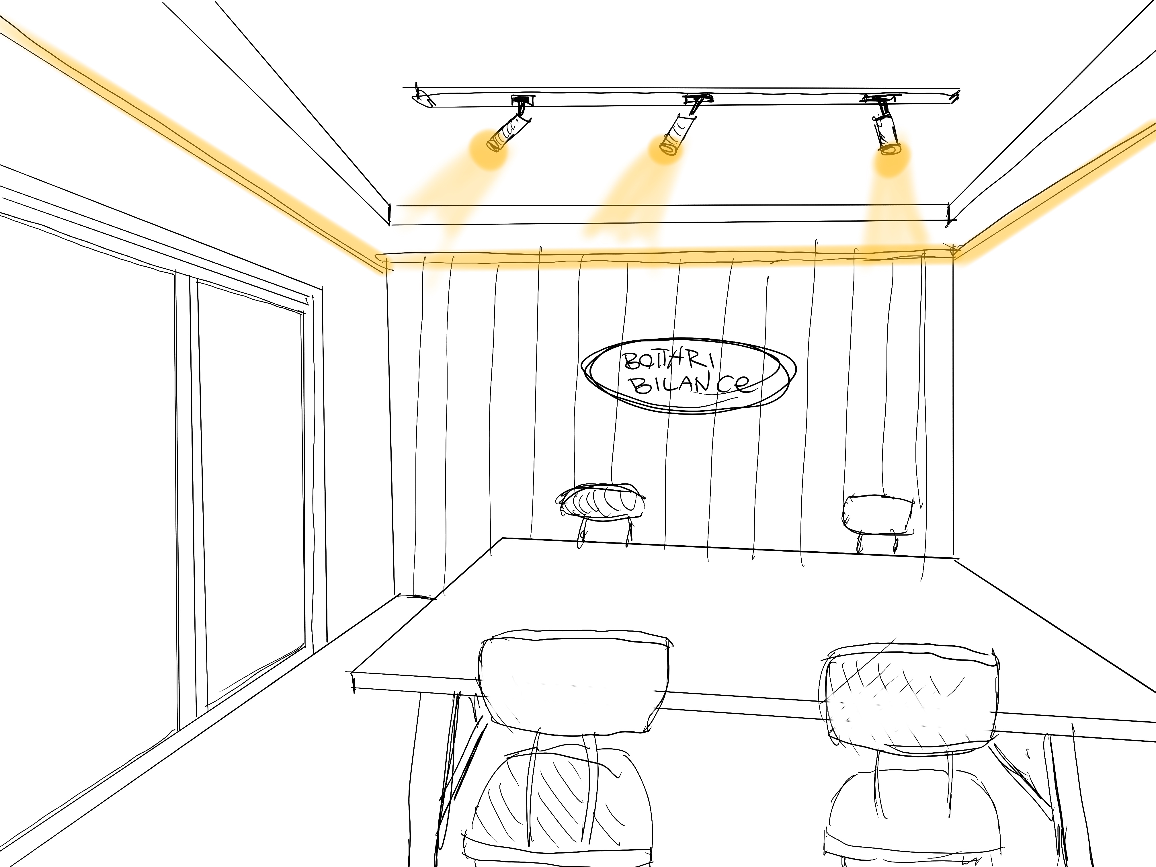 modern interior shot modern meeting room interior based on an architectural sketch rectangular room with a large window on the left side overlooking rolling green hills and countryside landscape central rectangular wooden meeting table with 4 seats contemporary design chairs wooden floor with natural oak finish perimeter ceiling led strip lighting integrated along the walls warm white light central ceiling track with adjustable spotlights illuminating the table minimalist and elegant atmosphere professional corporate style wall behind the table with vertical wooden panels clean lines modern architecture soft natural daylight entering from the window photorealistic render architectural visualization wide angle view high detail realistic materials and lighting architecture