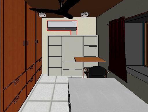 modern interior shot a cozy minimalist bedroom with warm wood tones and modern furniture the wardrobe is a rich mahogany brown and the ceiling fan is a sleek black the air conditioner above the wardrobe is white with a subtle red trim the walls are a soft olive green with a large window framed by deep burgundy curtains the desk is a light oak color complemented by a simple black chair the floor tiles are a light gray adding a neutral balance the atmosphere is calm and inviting perfect for relaxation and focus architecture