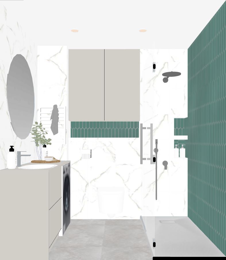 add led light around mirror and under the drawer above the toilet and on the top of right wall between ceiling and wall do not change anything there is no window make drawers light beige not grey not wooden