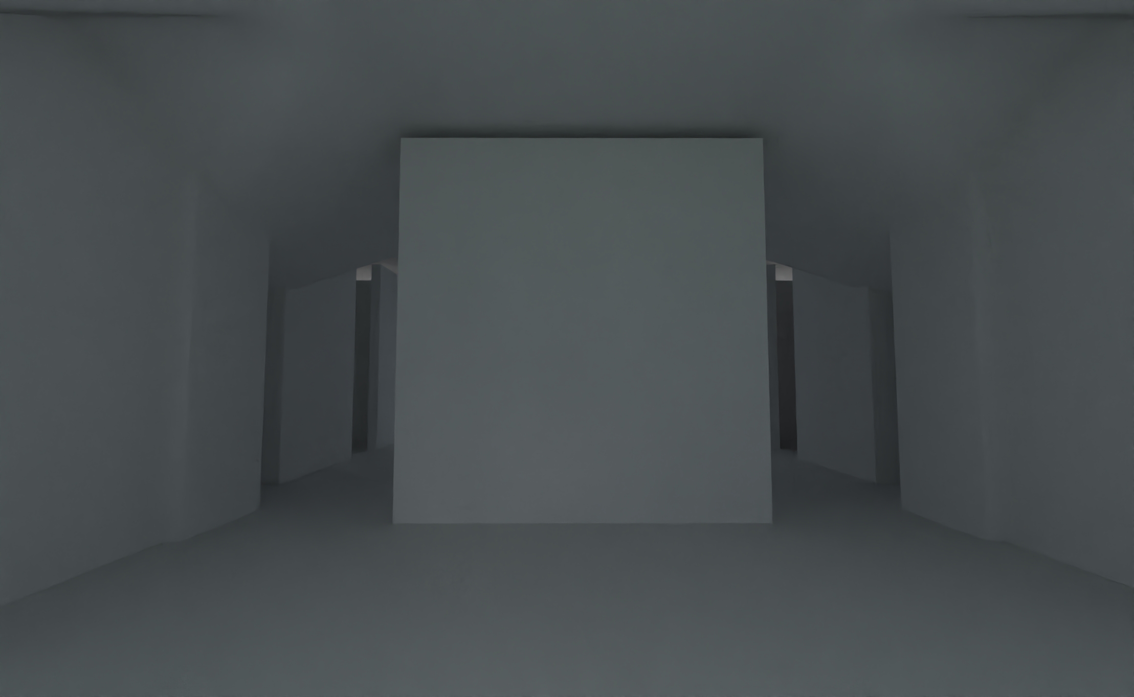 monumental contemplation hall double height 20 ft feature wall 8 ft tall door openings visible at the sides for scale reference very high ceiling vast empty volume soft curved ceiling transitions two oval freestanding upholstered seating islands low lounge height symmetrically placed neutral boucl fabric organic marble terrazzo flooring quiet museum like minimalism diffuse skylight glow wide angle interior photograph 24mm lens camera 5 6