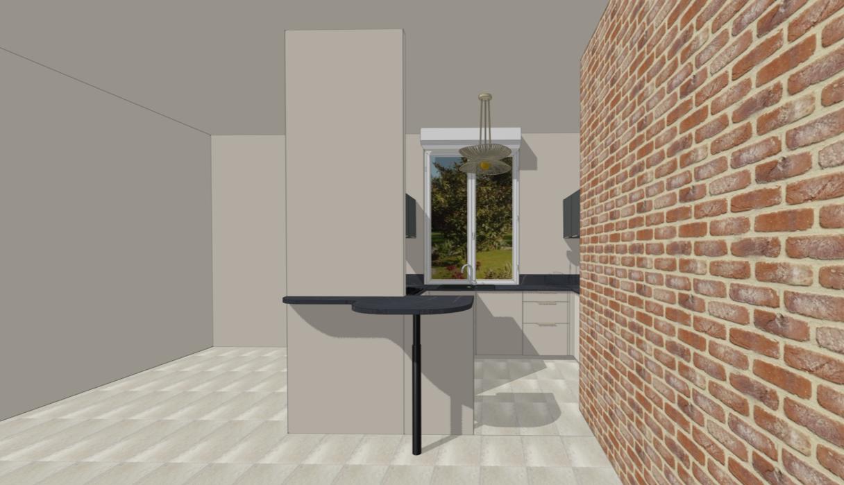 ajoute de la d coration et de la vaisselle sur le plan de travail ajoute de la d coration sur le mur au dessus de l ilot et un tabouret devant conserve les couleurs de l image
