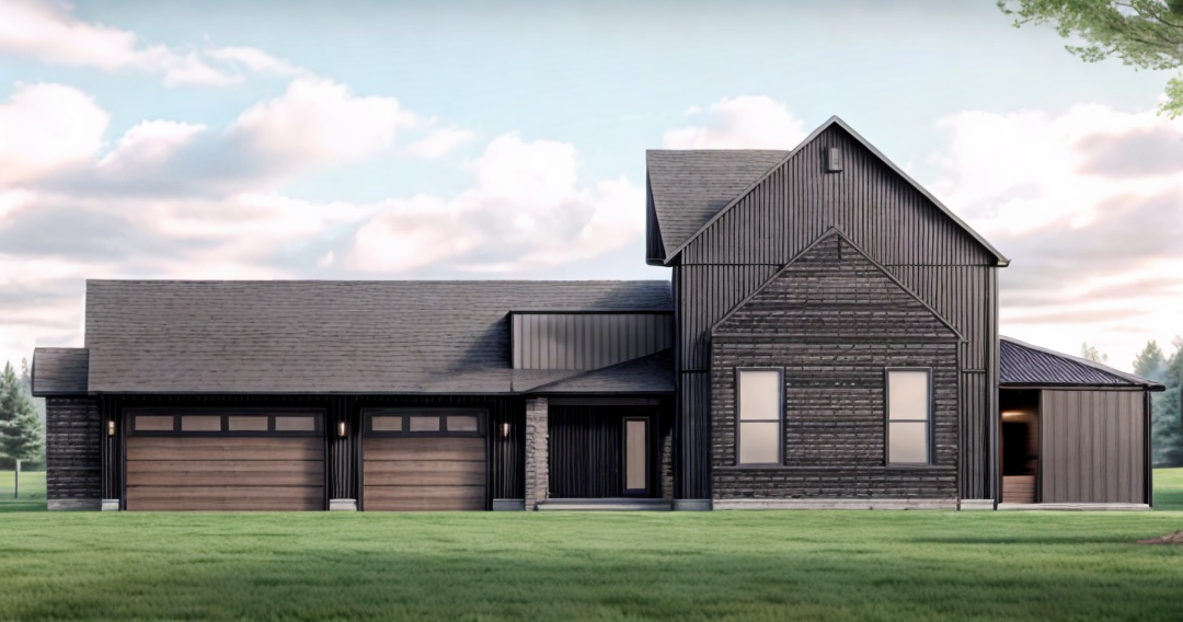 exterior shot create a realistic rendering of a modern suburban house with a textured brick facade use warm neutral tones for the bricks to convey a cozy welcoming atmosphere accentuate the structure with wooden slats in a soft natural wood color cast soft shadows to highlight the architectural details the roof should be a slate gray for a sleek modern look surround the house with lush greenery in vibrant shades of green and a clear blue sky adding a serene and peaceful ambiance board ans batten siding