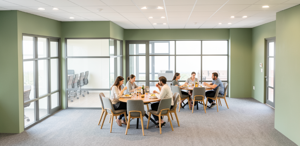 no background white acoustic tile ceiling carpet flooring walls with flat paint white and sage green walls so room doesnt look like a hospital