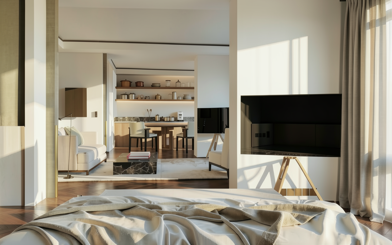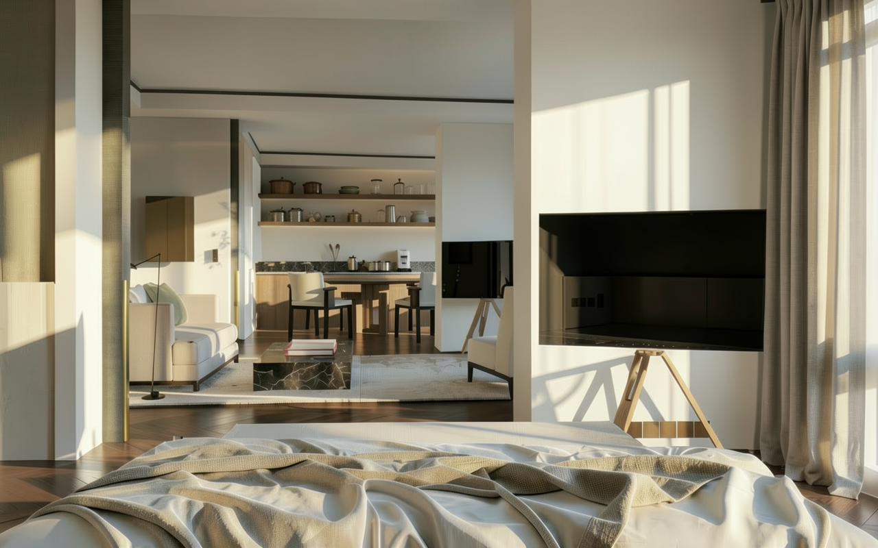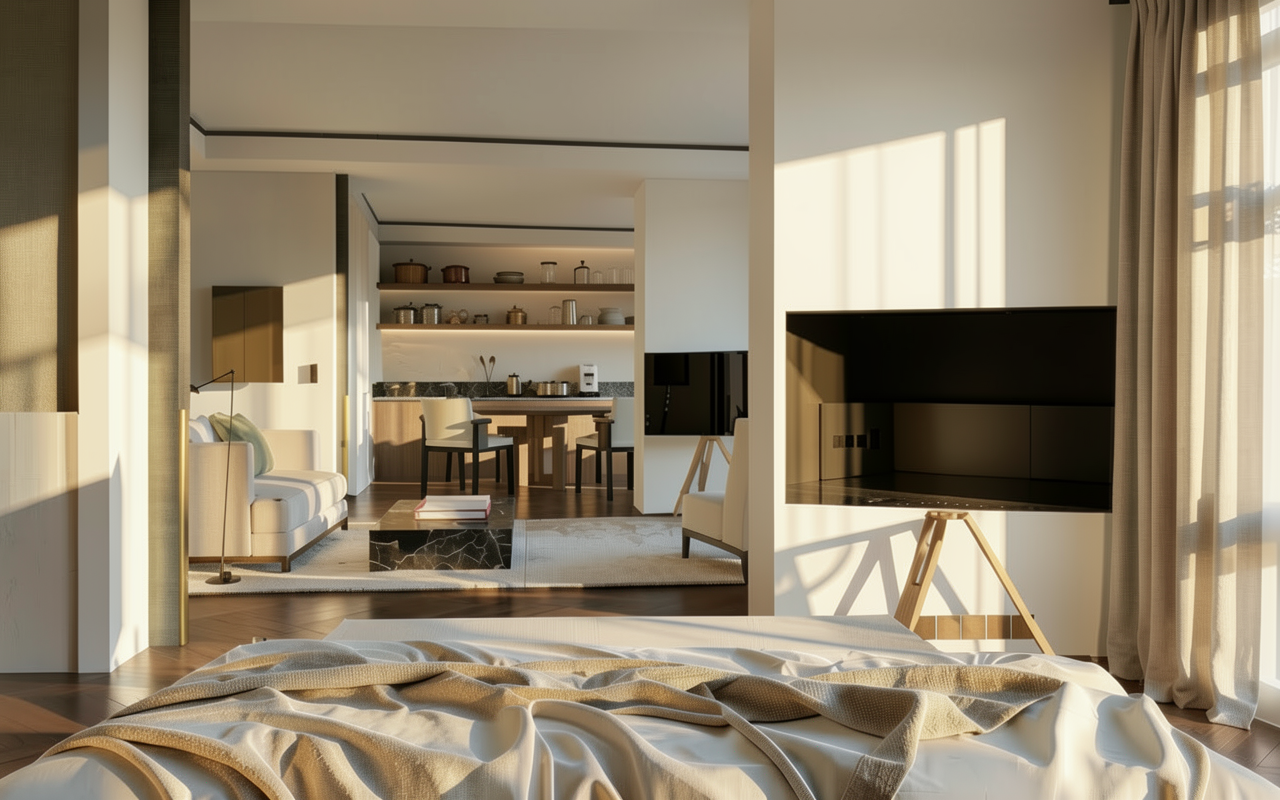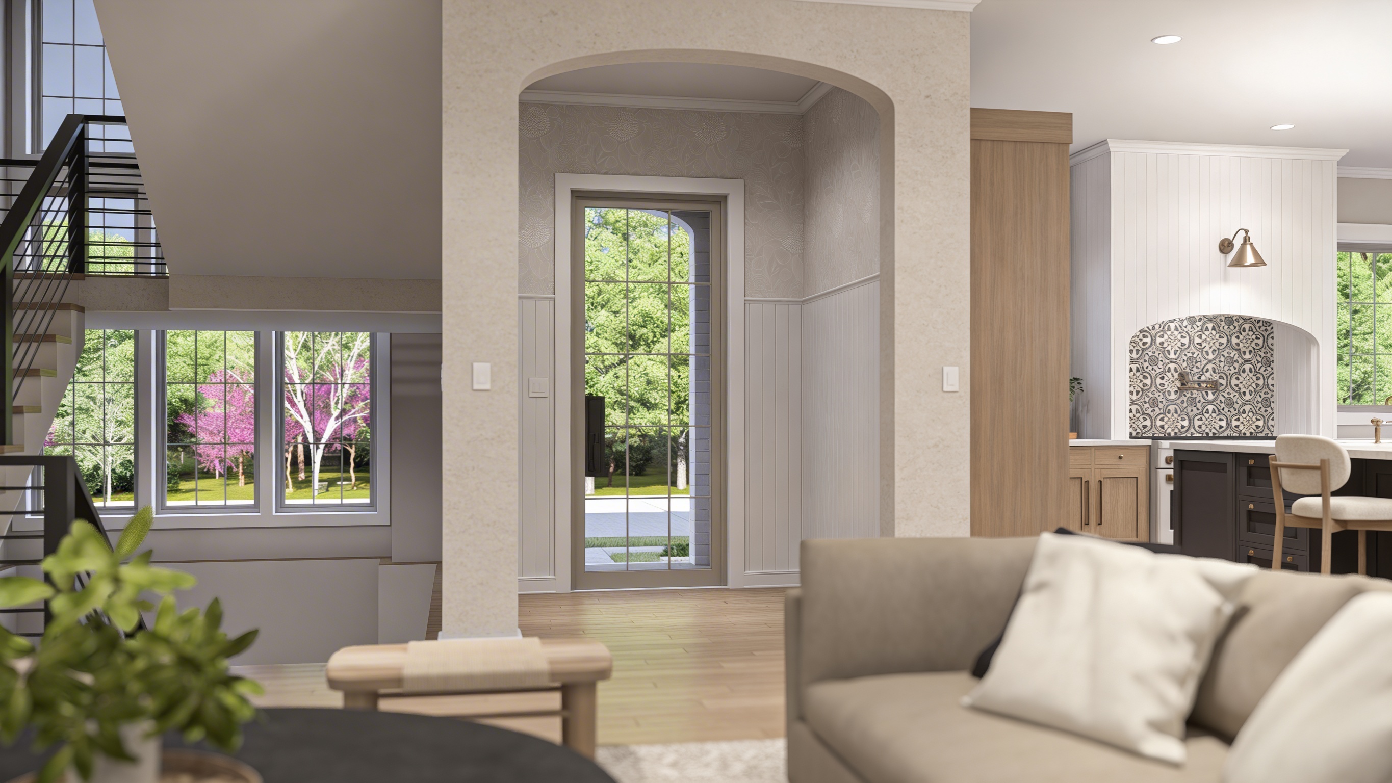 enhance the lighting and more the ligthing softer make the lighting warmer add reflections to the floor tile and glass surfaces