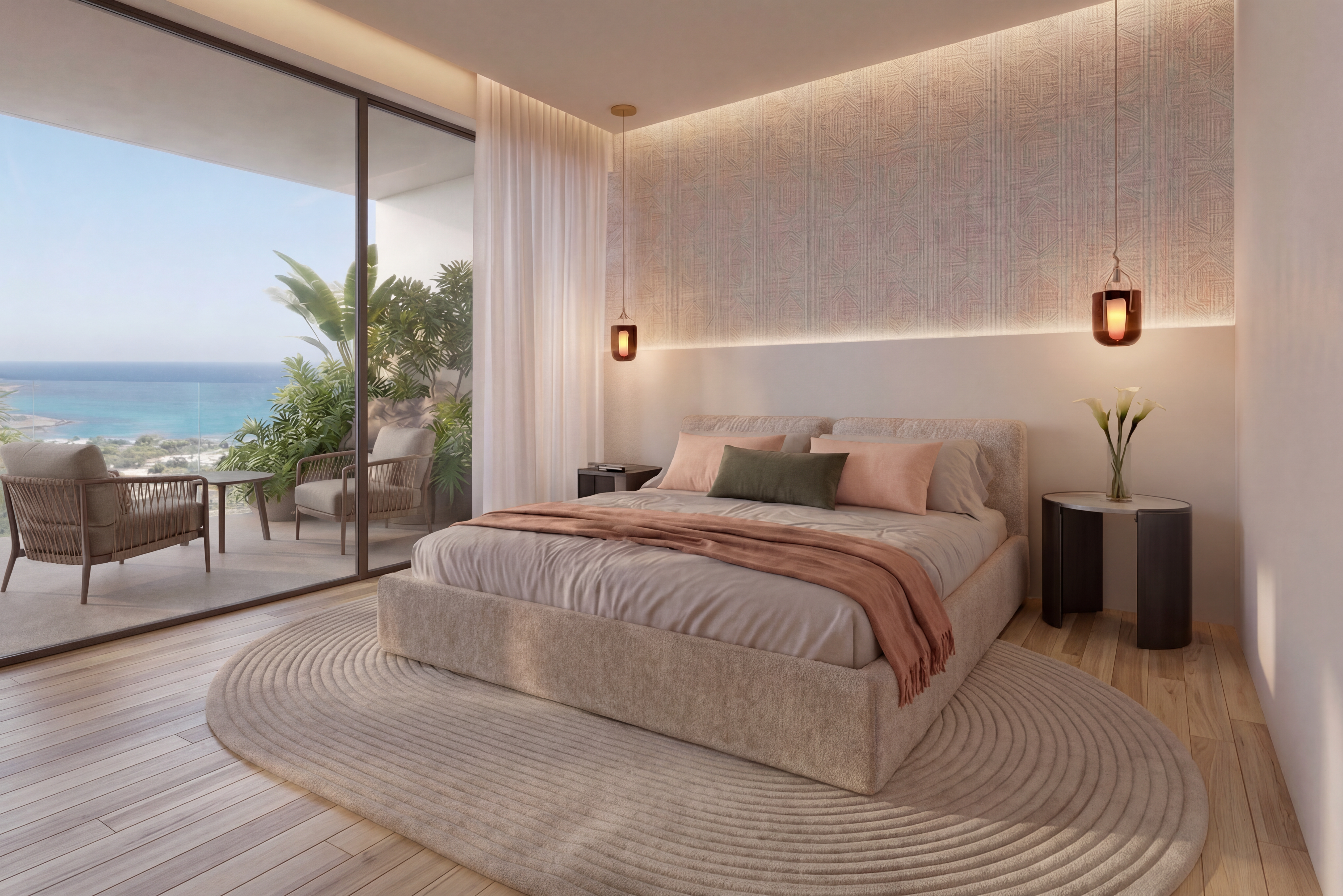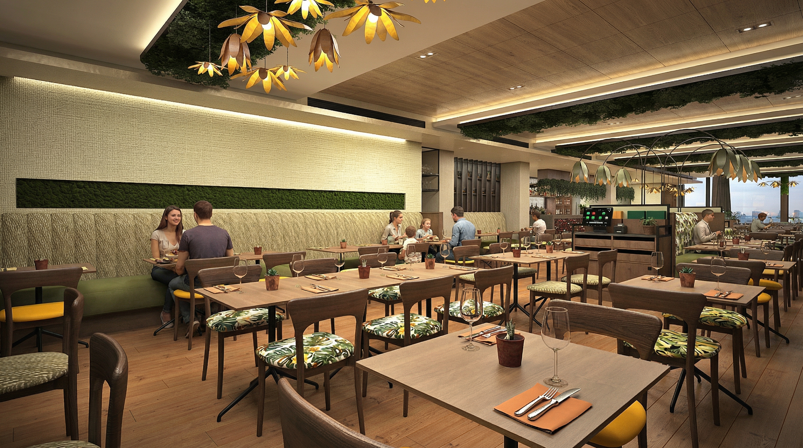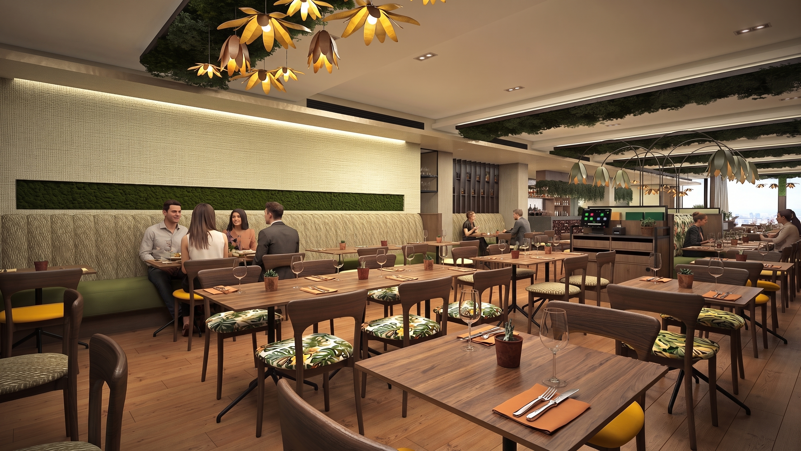 enhance the lighting and more the ligthing softer make the lighting warmer add reflections to the floor tile and glass surfaces