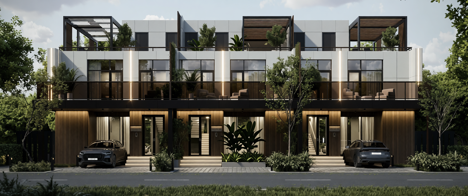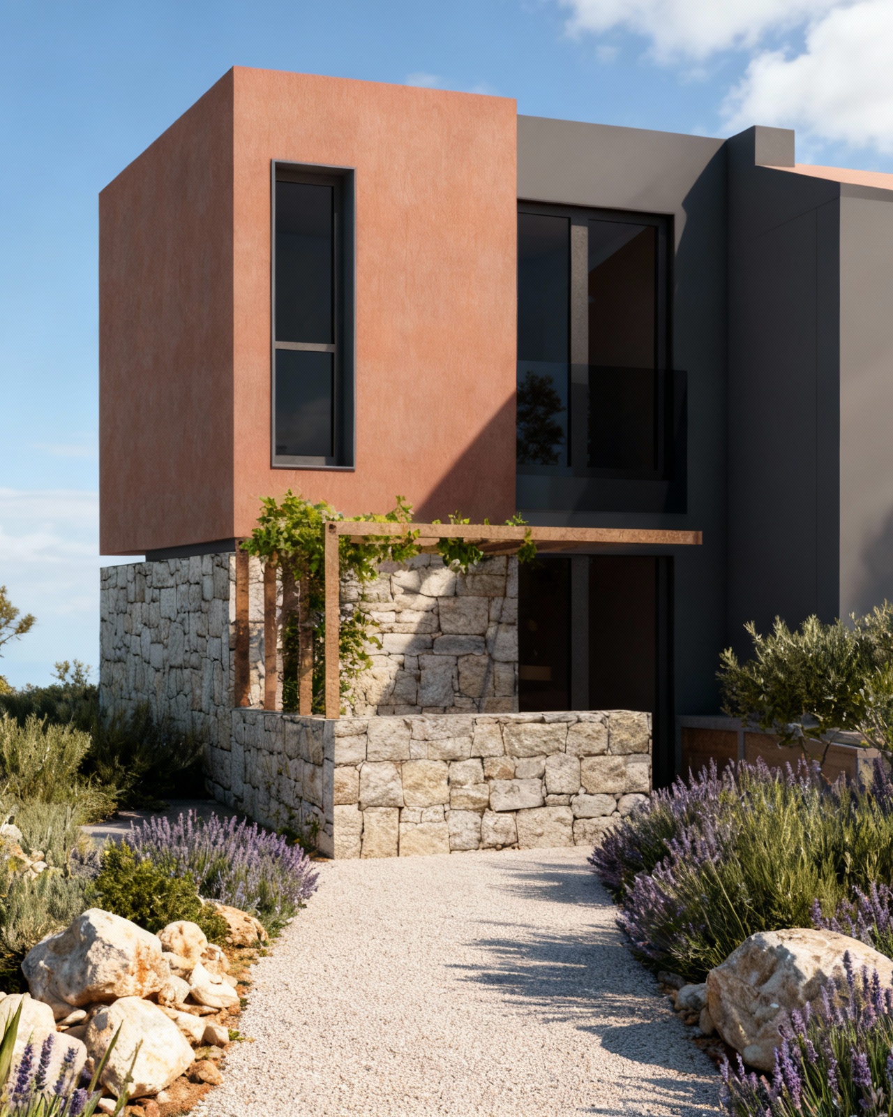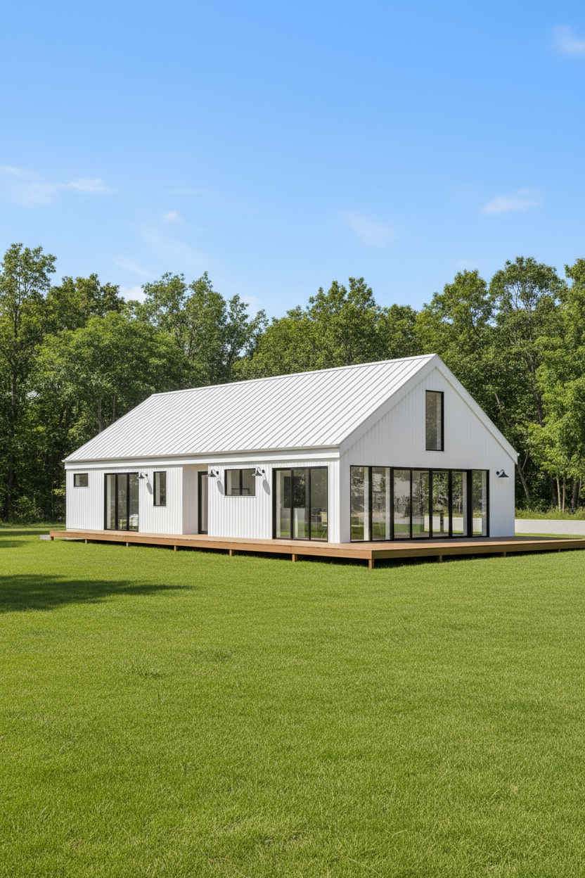 only use windows from original model image show window and doors frames in white no external light fittings surrounded by grass with trees in the distance