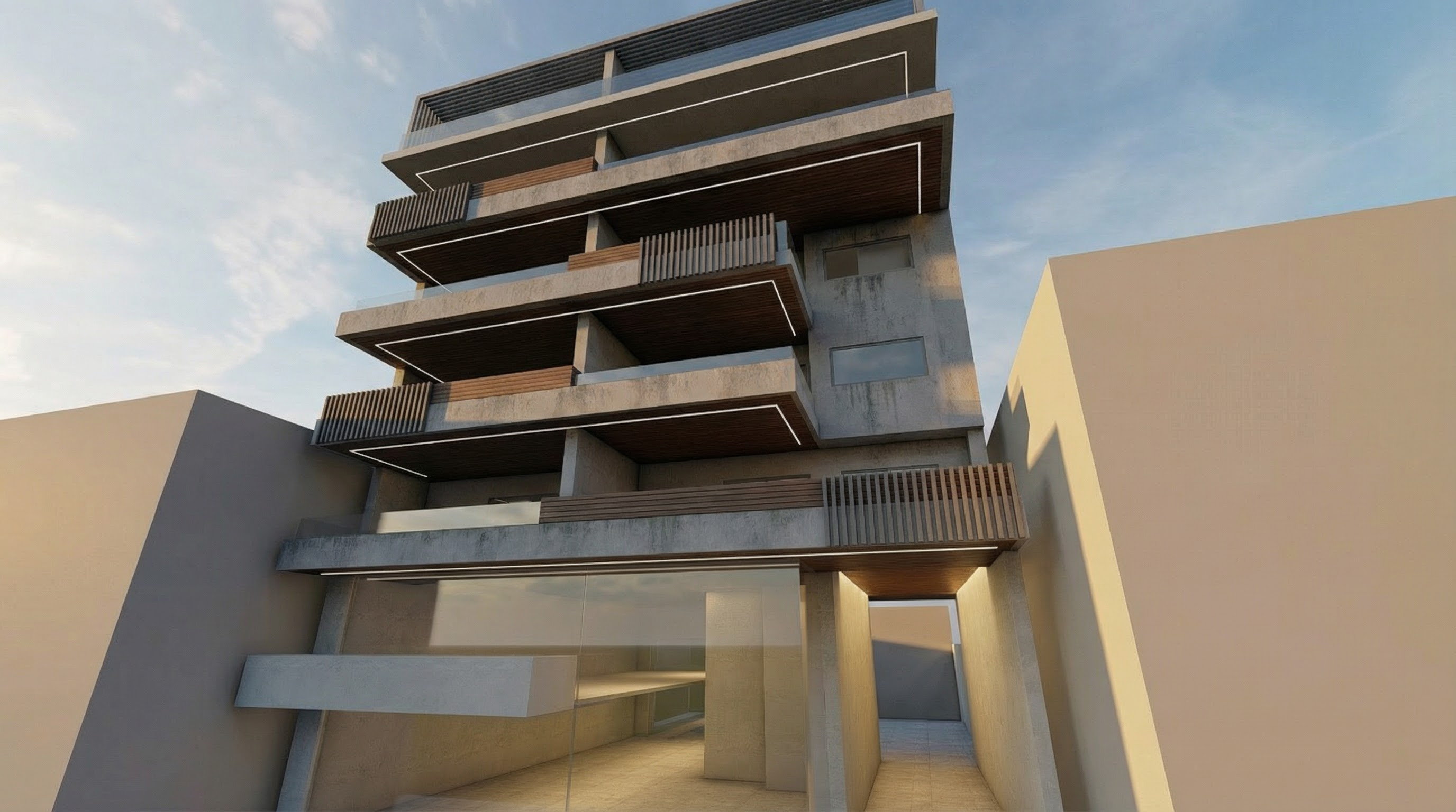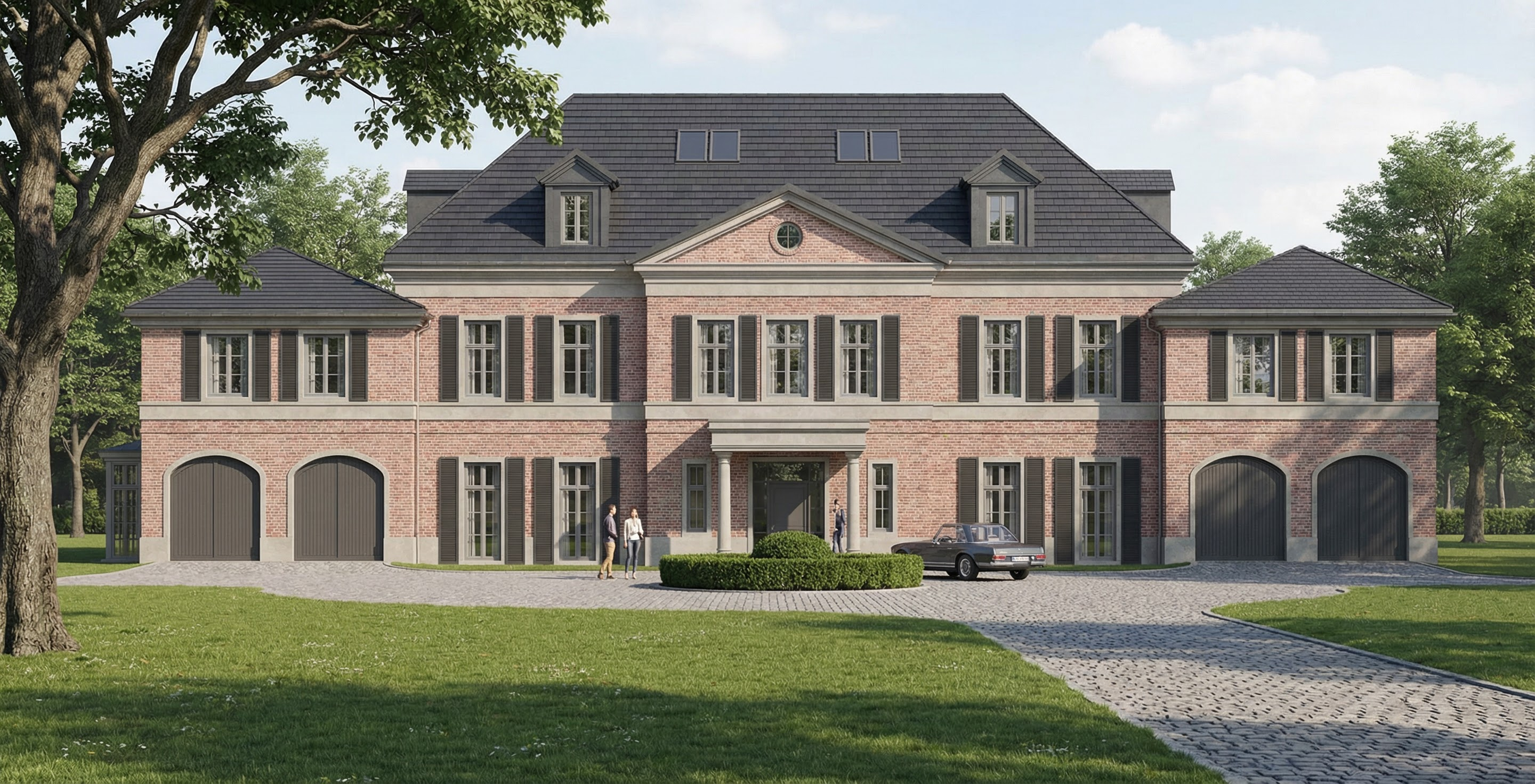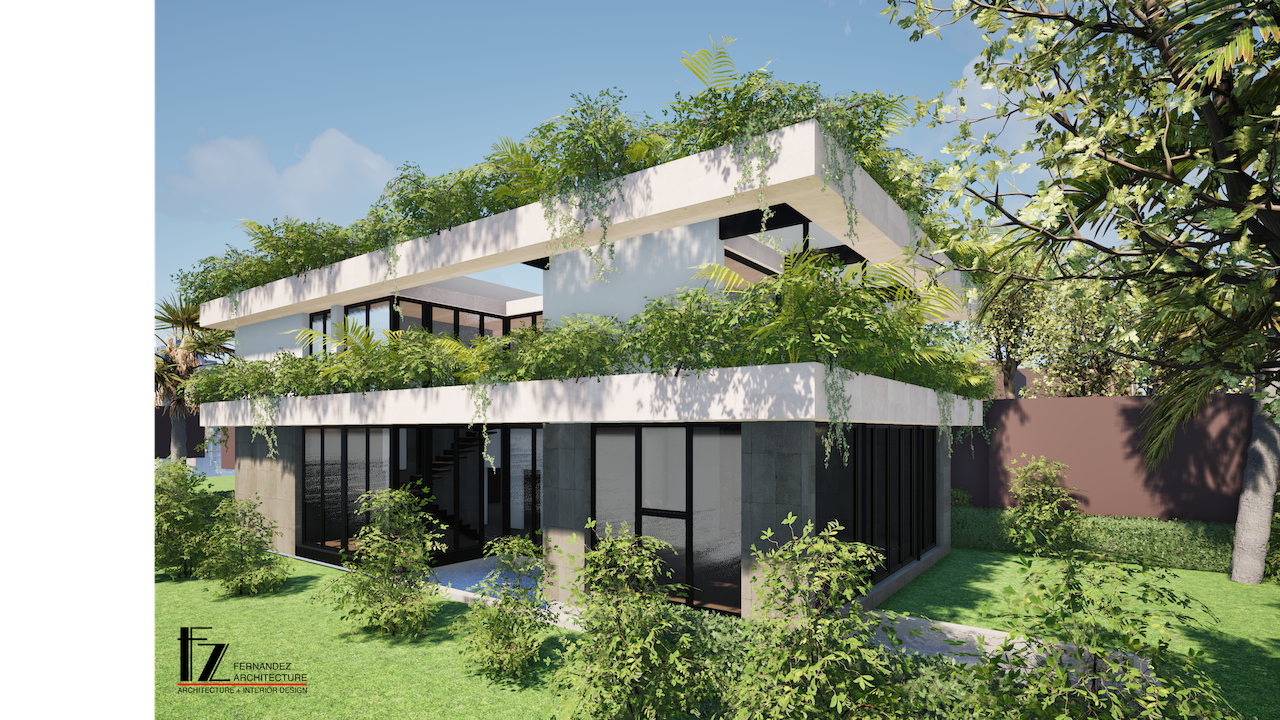 architectural modern house surrounded by tall lush trees with thick brown trunks and vibrant green leaves the house has a clean contemporary design with white and light gray exterior walls large windows reflect the bright clear blue sky a sleek blue car is parked on a pristine white driveway the lawn is a vivid green bordered by neatly trimmed hedges the atmosphere is serene and inviting with soft sunlight casting gentle shadows on the ground