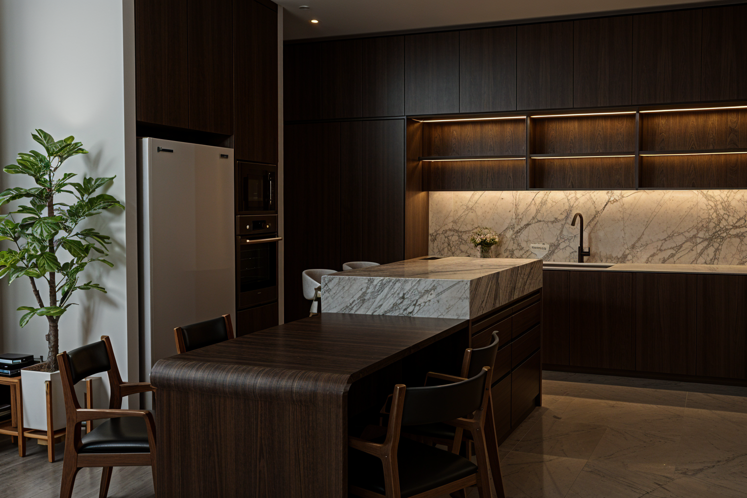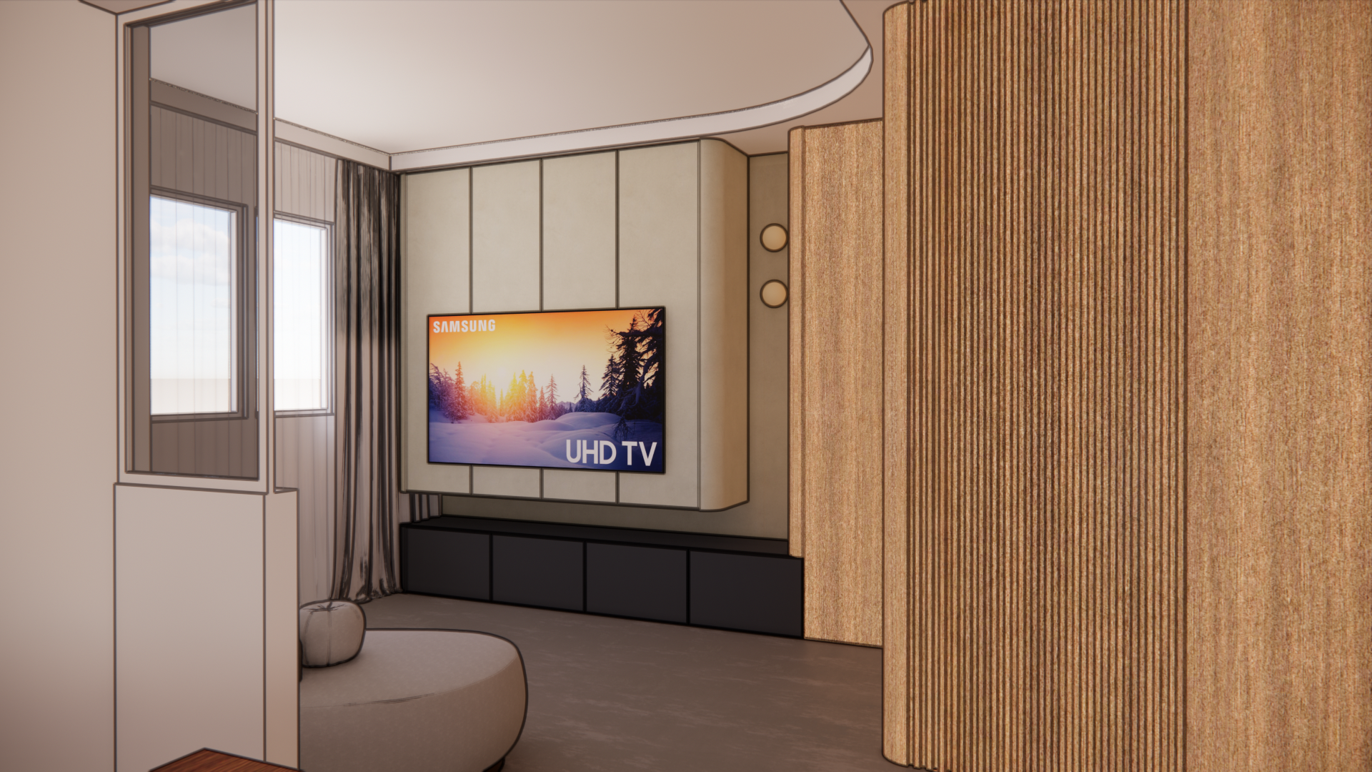 render a beautifully detailed room interior with an elegant large wooden cabinet covering one wall the cabinet features rich mahogany finish on its lower panels and softly illuminated honey yellow shelves above the walls are painted in a soothing light gray and the floor is a sleek dark charcoal the ceiling above is a gentle medium gray creating a cozy warm and inviting atmosphere include ambient lighting to enhance the wood s natural grain and the subtle yellow glow of the shelves creating a sophisticated harmonious ambience