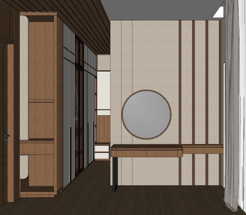 create an ultra realistic image from this jpg add ceiling spot lights use soft light wood textured to the floor and use warm off white for walls and the ceiling is white and add indirect light to the shelves add some decoration and add indirect light to the wood ceiling panel add indirect light to the circle mirror add stool for dressing table