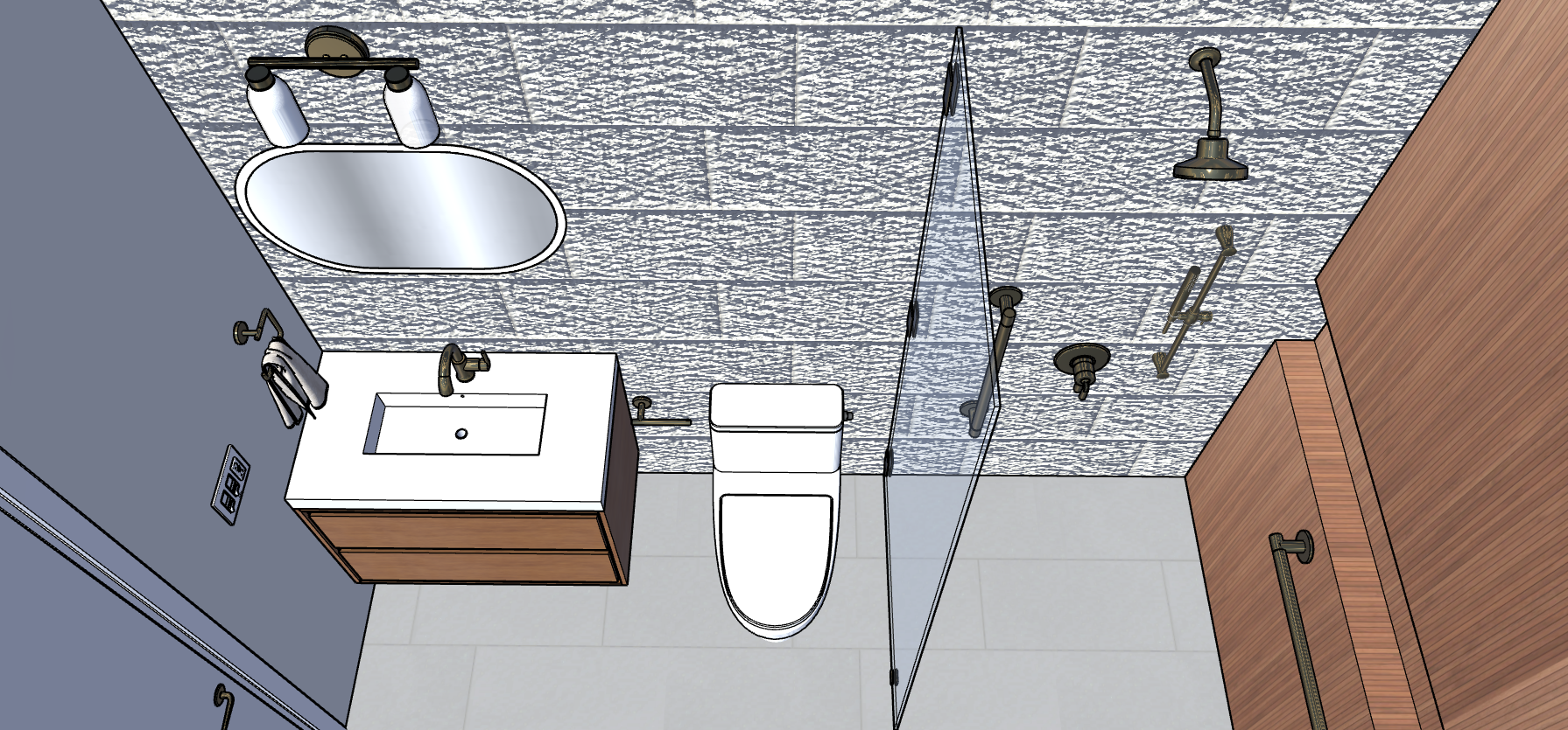 maintain all existing geometry materials and proportions the vanity light uses white semi transparent glass sconces with soft diffusion the mirror has a subtle white backlit halo that is off no glow the shower contains no lighting of any kind the niche shower head and shower wall are not light sources overall scene should be brighter and evenly lit using neutral 3500k ambient lighting from ceiling fixtures only do not add move or reinterpret any light sources