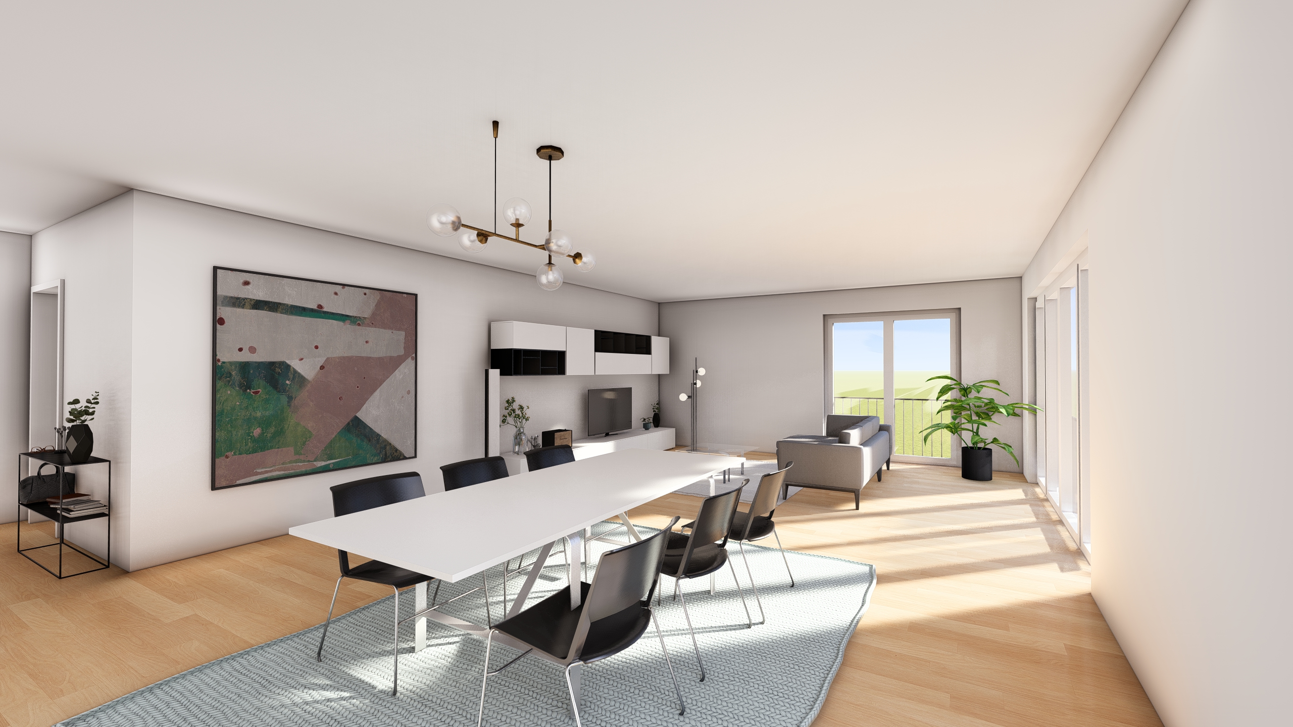 a modern livingroom with bright daylight in front of the windows there are curtains