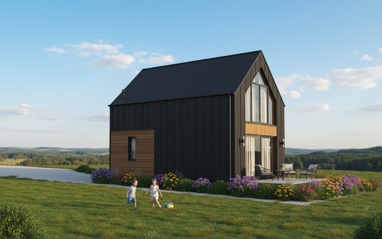 make photo realistic add driveway front walk landscaping with river rock and low mountains in background sun at front of house early afternoon asphalt shingle roof gable fascia trim is dark green except for at front timbers very dark green trim and siding