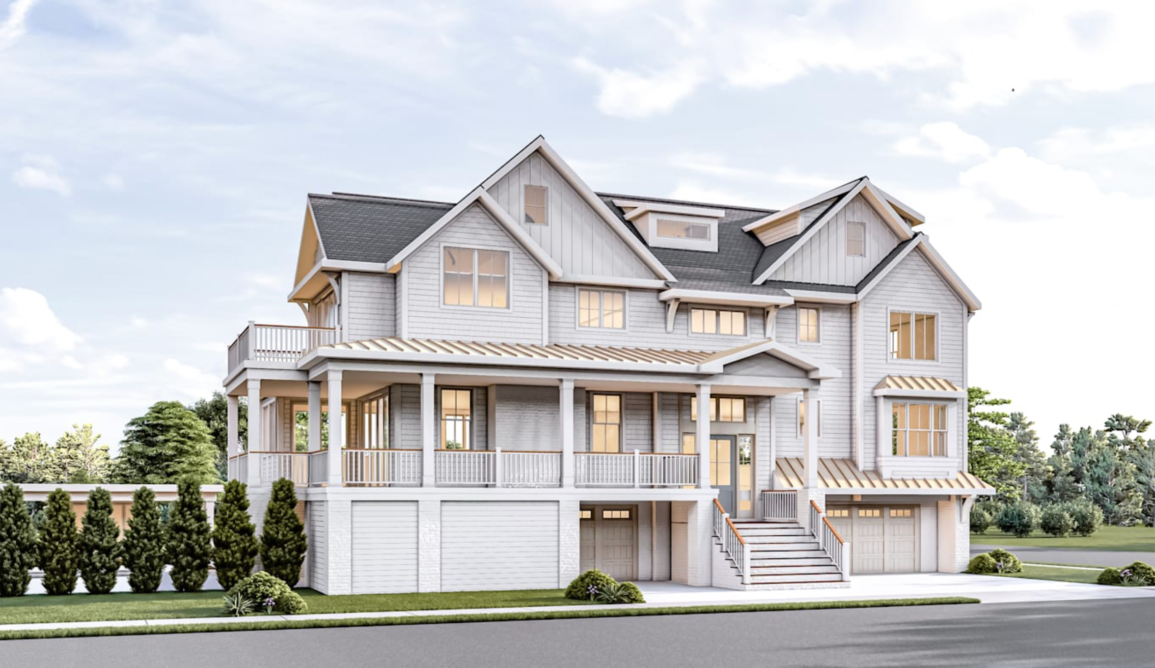 exterior shot enhance this architectural render for hyper realism while maintaining all existing colorways refine materiality with accurate textures wood grain brick glass reflections metal finishes and realistic surface qualities specular highlights and depth improve landscaping with lifelike foliage natural shadows and atmospheric lighting that reflects time of day conditions calibrate scale proportion and depth of field for photographic accuracy elevate details such as window reflections ground textures and edges for maximum realism while ensuring the design intent and overall palette remain true to the original render architecture