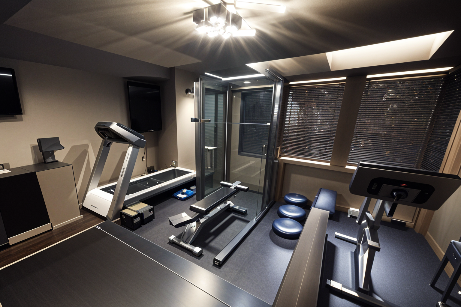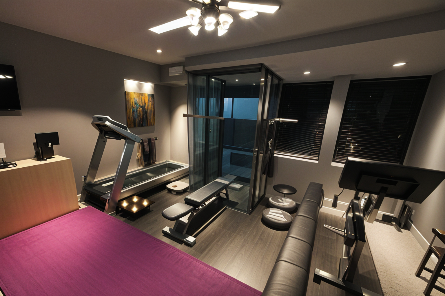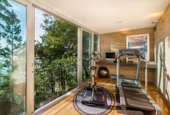 high tech interior shot luxury basement gym in a west vancouver home recessed ceiling lights treadmill rowing machine yoga mats light wood accents spa like modern aesthetic glass wall divider with view of wine cellar architecture