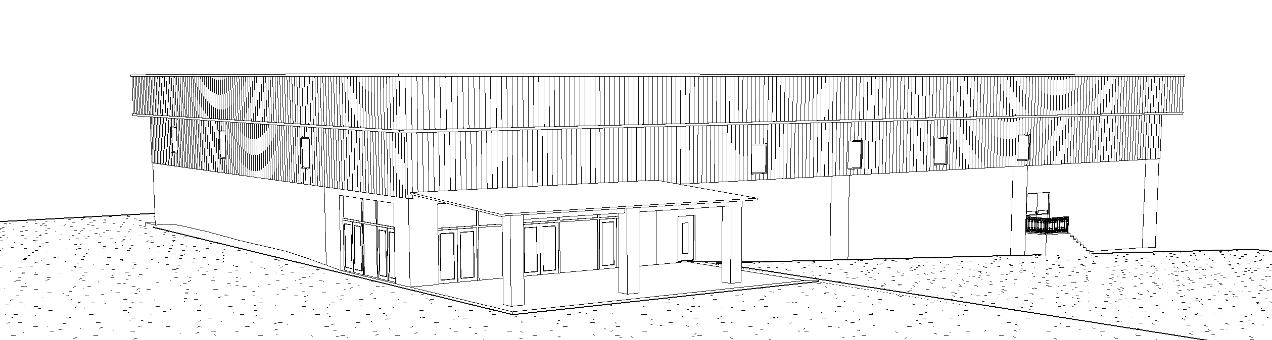modern church building with black bronze metal siding on the top and light beige stucco on the bottom the overhang is black bronze the doors and windows are black bronze as well
