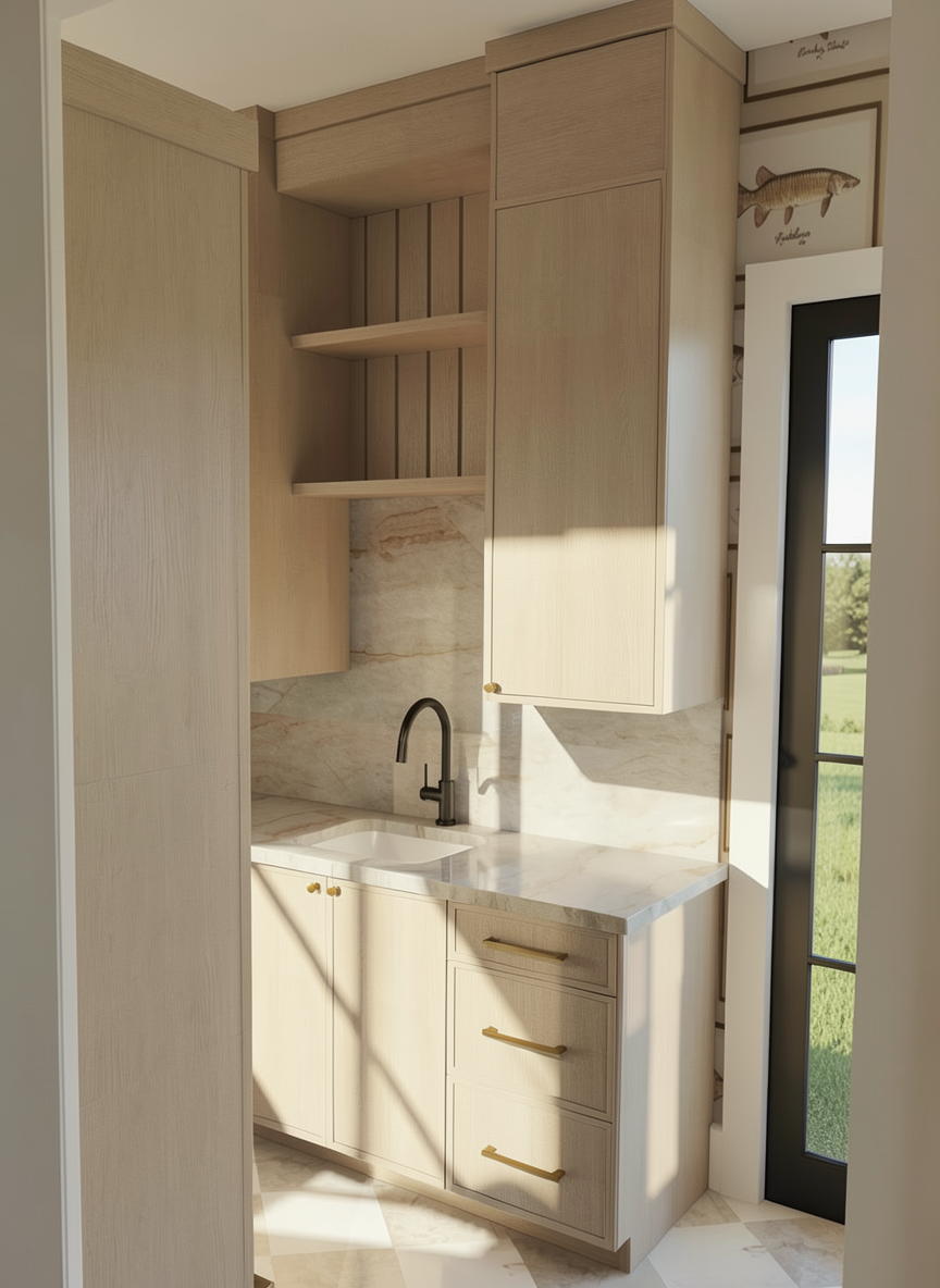 reception area of a public bathhouse perspective view from corner materials must remain strictly as follows reception desk fascia is dark veined black and white marble lower panels are vertical fluted warm walnut wood laminate with brass drawer pulls white stone countertop the freestanding partition screen is constructed of thick natural twisted jute rope strands each rope is approximately 20 25mm in diameter tightly twisted with visible fiber texture and natural tan cream coloring hanging vertically in parallel rows from a warm walnut oak header beam and anchored to a matching walnut base frame the rope has organic variation in tone some strands slightly darker some lighter with soft shadows cast between each rope strand creating depth and rhythm the partition reads as a tactile artisanal element not painted rods not wood slats not string thick twisted natural rope lounge chairs are dark charcoal woven textile upholstery with tan leather seat cushion light oak tapered legs coffee table is dark nero marquina marble sofa is dusty mauve or warm rose upholstered fabric pendant lights are matte dark charcoal dome shades on black rods brass frosted globe wall sconces on white painted walls multilingual wayfinding signage in small serif text dark wood framed interior door floor is large format rectified porcelain tile in a wood look finish each tile is approximately 1200x200mm laid in a straight staggered brick bond pattern with hairline grout joints of 2 3mm in light grey the porcelain surface has a matte to satin sheen with a subtle reflective quality distinct from real wood the wood look print on the tile shows light blonde oak grain running along the length of each tile with soft variation between tiles some slightly warmer some cooler mimicking the look of a curated wood look porcelain collection like ragno woodtale or marazzi treverkever tile edges are sharp and rectilinear grout lines are clearly readable as a grid across the floor plane the floor does not look like real timber it reads unmistakably as large format porcelain with a printed wood grain surface ceiling panel is perforated terracotta toned decorative screen with organic oval cutouts natural daylight streams through the organic oval perforations in the terracotta ceiling panel with visible light shafts and defined circular and oval light projections landing on the white walls and porcelain floor below each perforation casts a distinct soft edged pool of warm natural light on the surfaces beneath overlapping and layering across the floor plane and upper walls like dappled sunlight through a canopy the light projections are clearly readable as shapes not just ambient glow the ceiling reads as backlit from above with natural sky light bright warm white light visible through each hole contrasting against the rich terracotta panel surrounding it light feels like midday sun filtered through an overhead screen creating atmosphere without orange color cast on walls light from ceiling reads as soft dappled warmth not a direct light source walls and floor should read as warm white and pale blonde not orange or red tinted interior artificial lighting from pendant domes and brass wall sconces is warm soft and low ambient incandescent quality no sharp hotspots no overblown light cones lighting feels like late afternoon indoor warmth not studio flash overall color temperature is neutral to slightly warm creamy whites natural wood tones charcoal mauve brass accents the terracotta ceiling should be a rich background element not the dominant color washing the room style is architectural collage render photorealistic material textures composited with a handcrafted editorial quality slight paper or print texture overlay analog film grain throughout visible material sample quality each surface reads as a distinct tactile material mixed media feel part architectural photography part printed mood board muted sophisticated palette medium format lens perspective slight vignette