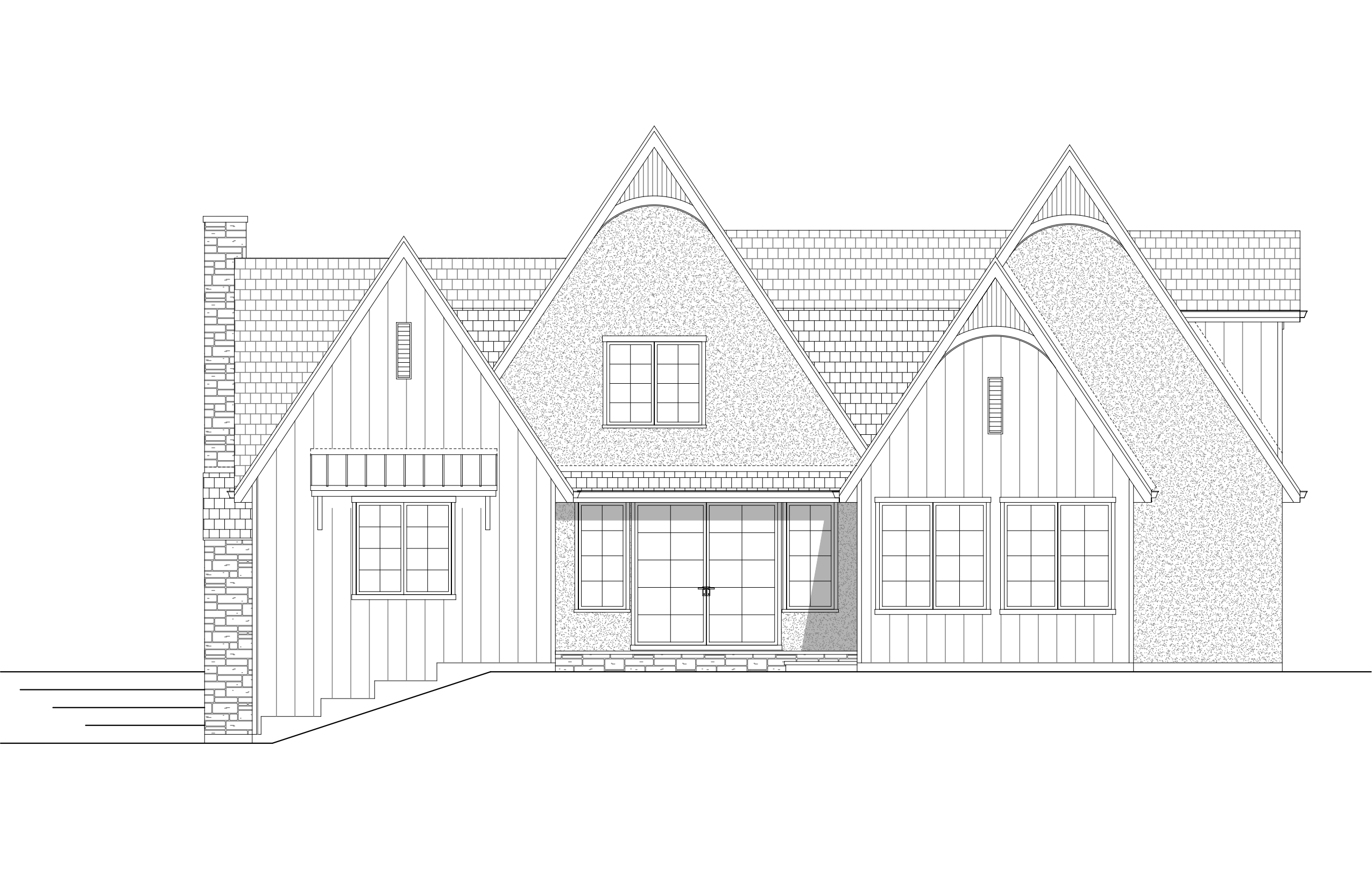 keep geometry grainy watercolor render of charming cottage building rear view with black wood siding off white stucco stone wainscot watercolor trees and prairie environment in the background extensive watercolor landscaping surrounding the building prairie landscaping in the background cozy atmosphere sloped grade to the left middle of the house is set back 18 feet from front gables