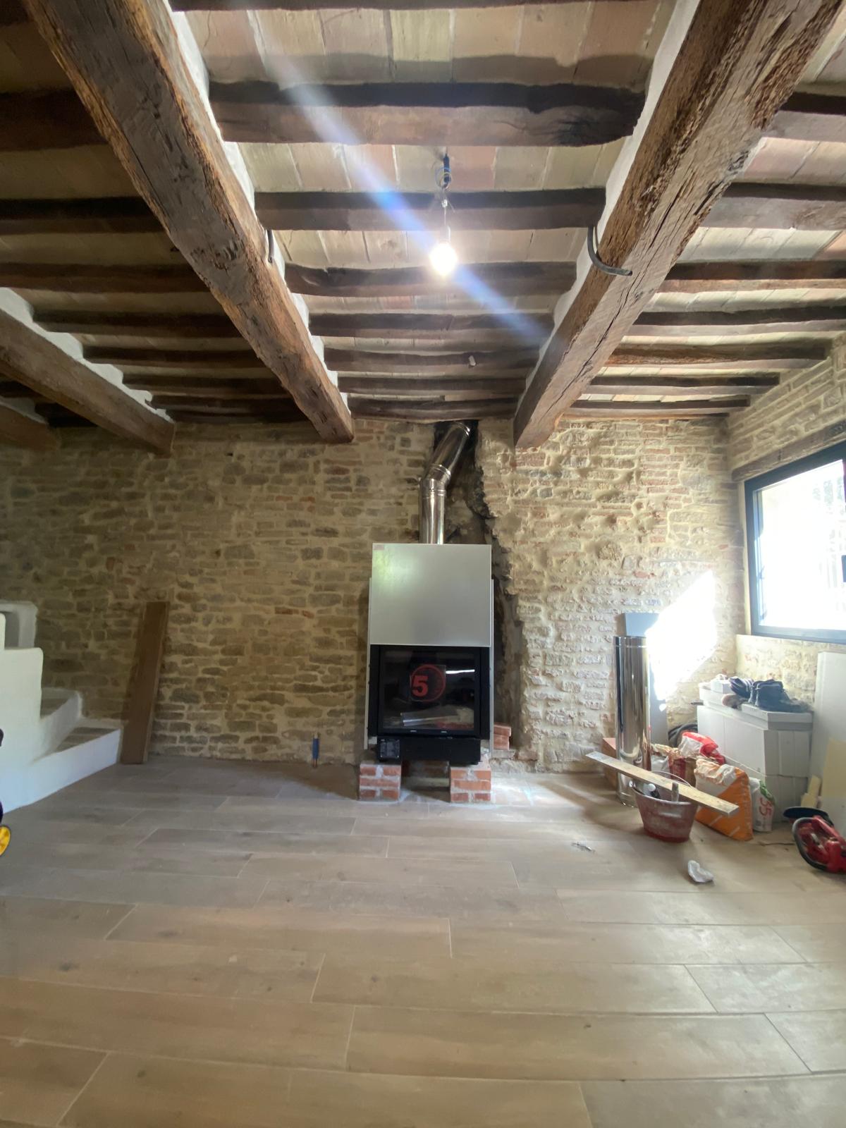 use the same image add a rustic fireplace using stone wood and white plaster add spotlights to light the room add some plants and a couch add countryside landscape outside the widow