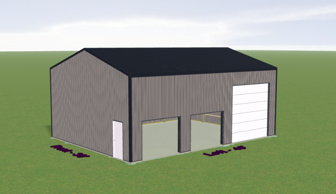 make building look real in a sunny landscape with a mowed yard and rural trees in the background add a rock driveway to the overhead doors