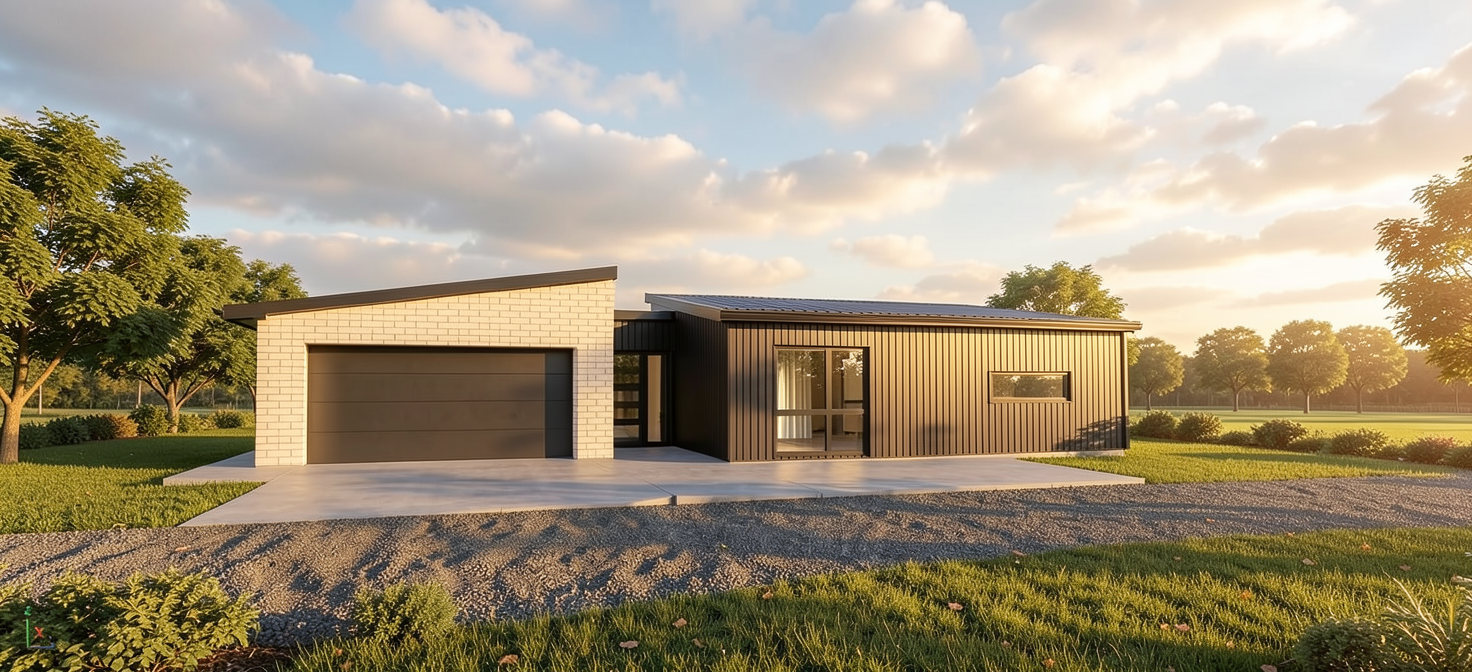 prompt a high end architectural visualization of a modern residential estate consisting of several minimalist modern barn houses the buildings feature a sharp gabled roof without eaves clad in dark anthracite standing seam metal panels that seamlessly transition from the roof down to the upper facade the lower facade is finished with clean white architectural concrete panels large vertical floor to ceiling windows with dark wood frames environment a cohesive neighborhood layout with neat permeable paver driveways and organized pedestrian paths lush professional landscaping including manicured green lawns low trimmed boxwood hedges and scattered ornamental grasses tall deciduous trees in the background under a clear soft daylight sky technical style photorealistic 8k render cinematic lighting archviz style v ray aesthetic crisp details natural color palette slight wide angle lens clean suburban atmosphere