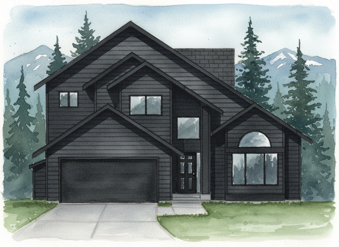 watercolor render of modern home painted with neutral colors and stone accents include trees and an alaska like environment in the background simple driveway and walkways in front of the home