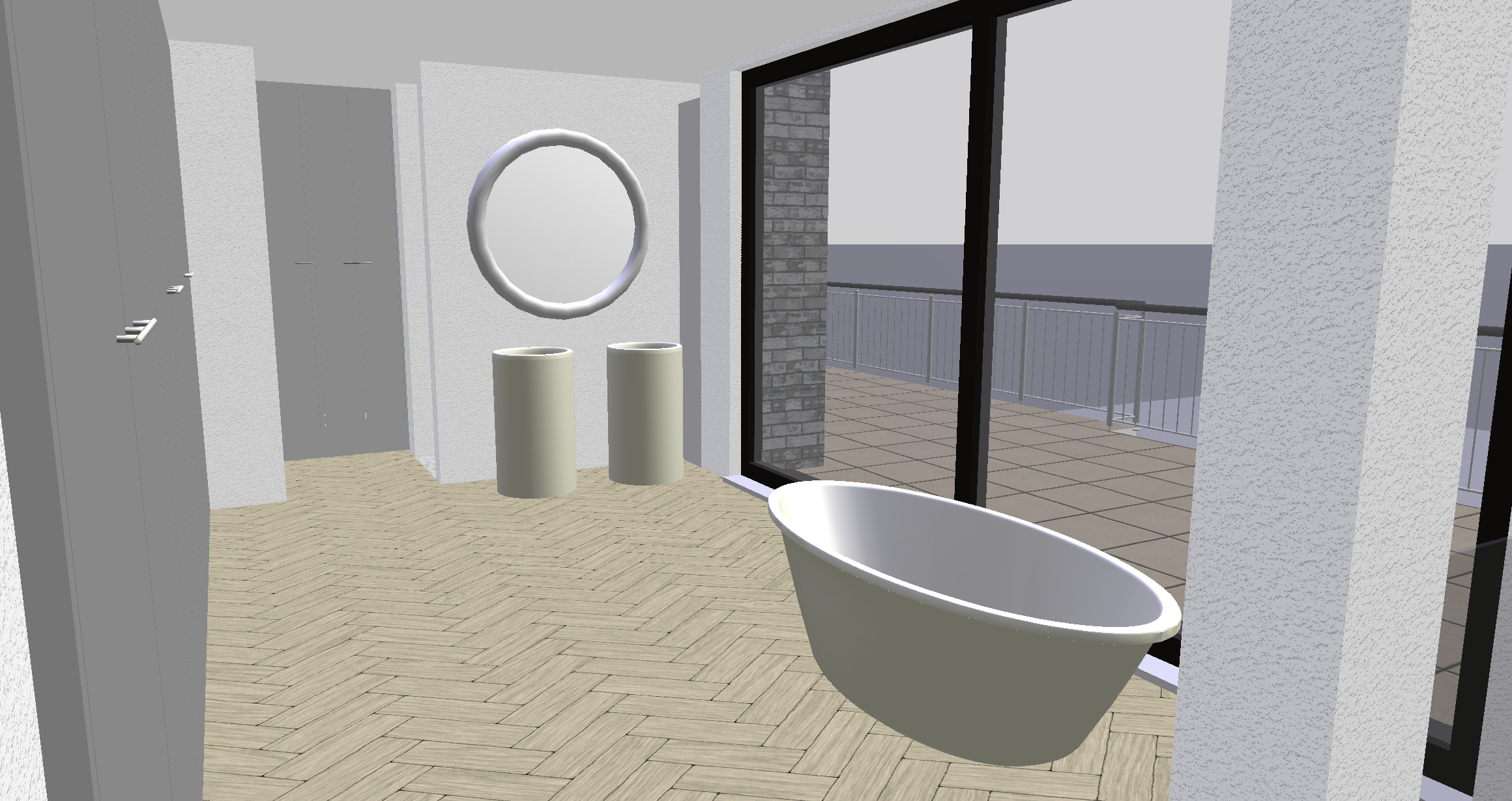 genau dieses rendering berarbeiten fotorealistisches innenraum foto exakt dieselbe perspektive und kameraposition wie das hochgeladene referenzbild 100 identische raumgeometrie exakt gleiche m belanordnung exakt gleiche verlegeart und richtung von parket wie vorlage exakt identische fensterpositionen mit gleichem ausblick durch die fenster weiches nat rliches tageslicht leicht schr g einfallende sonne durch die grossen fenster geschlossene r ume k nstlich ausleuchten sanfte realistische schatten blickrichtung ist nach osten sonnenlicht kommt von s den realistische materialien echte holztexturen stoff mit leichten gebrauchsspuren hochwertige oberfl chenreflexionen kleine gr npflanzen lavabo aus marmor collemandina grigio in braungrau dahinter je eine vola standarmatur fs2 edelstahl badewanne ersetzen mit modell reflex von antonio lupi in weiss mit standarmatur fs1 edelstahl links hinten bei den lavabos hat es einen schrank f r badet cher schrankfronten alle grauglas gl nzend grifflos parket vergraut vollkommen rahmenloser spiegel rechts hinter den lavabos ist die dusche hell ausgeleuchtet alle sichtbaren w nde sind sichtbeton graues badetuch l ssig ber badewanne werfen sehr modernen minimalistischer look nat rliche farbwiedergabe golden hour feeling das bild muss wie eine professionelle fotografie aussehen es soll ein echtes und reales foto sein canon eos r5 35 mm festbrennweite f 2 8 hyperrealistisch dslr qualit t raw aufnahme 8k aufl sung extrem scharf perfekte tiefensch rfe professionelle architekturfotografie