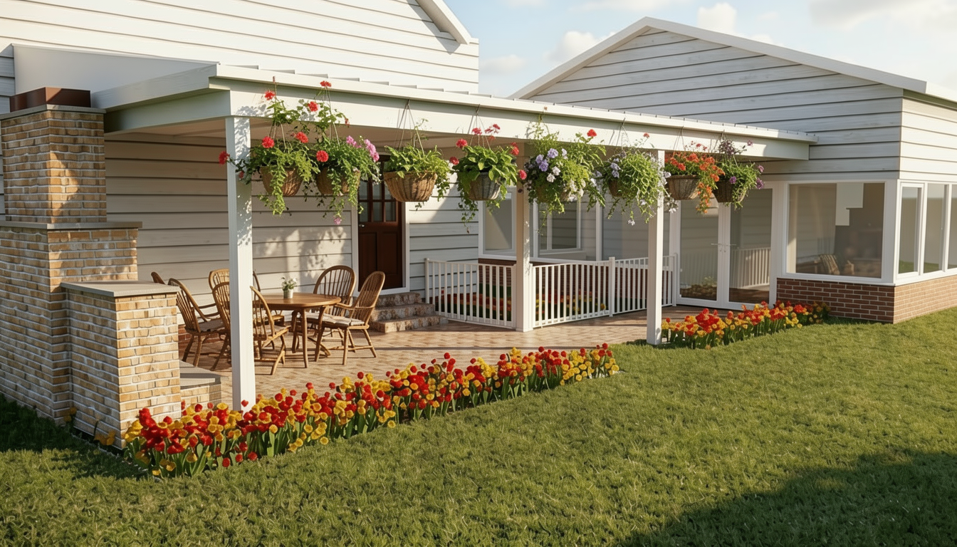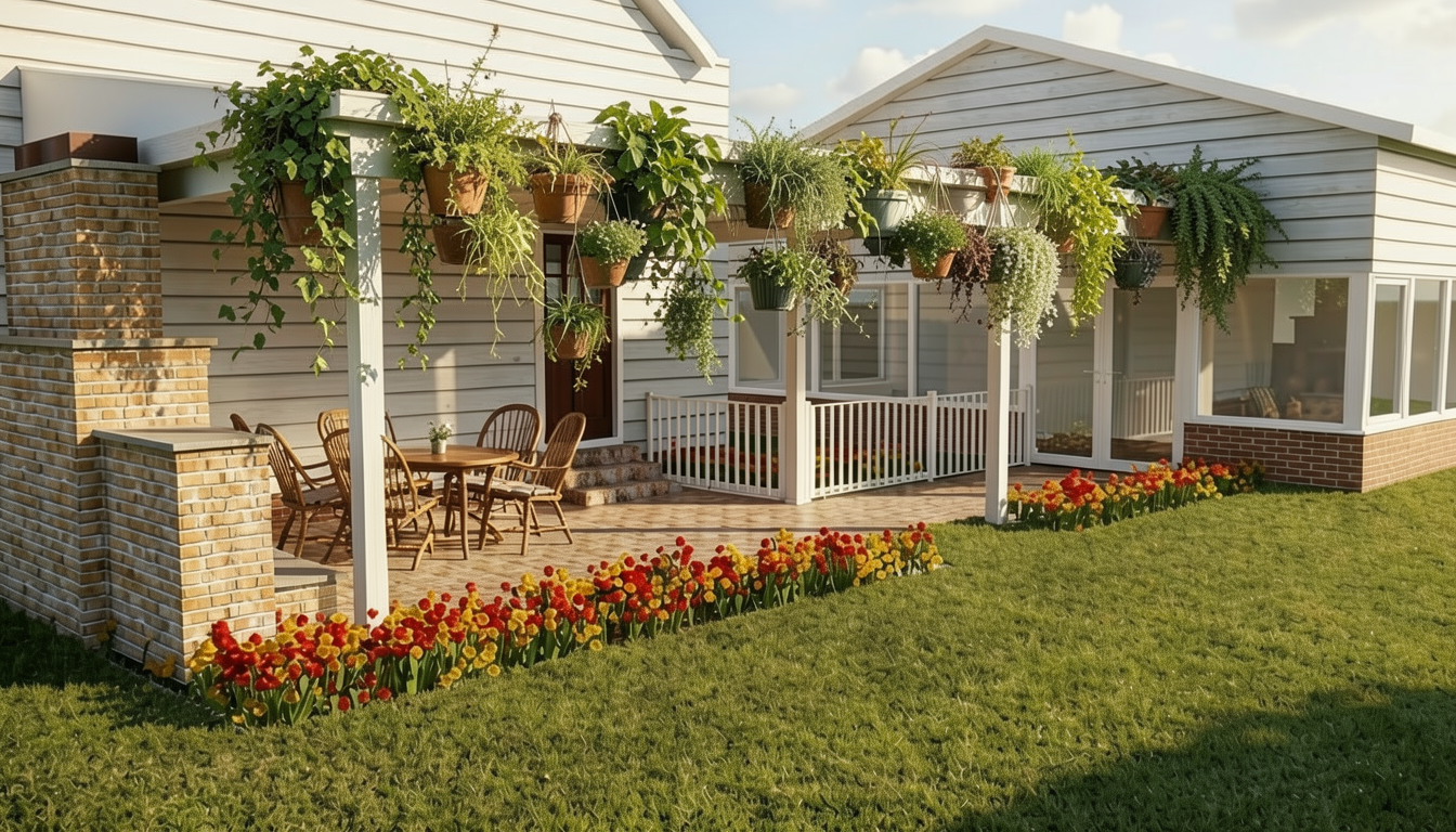keep image exactly the same but add hanging plants to overhang