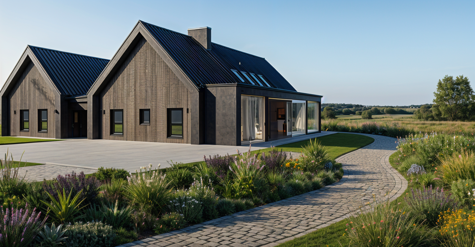 create a cement pad outlined by cobblestone paths and gardens of native plants