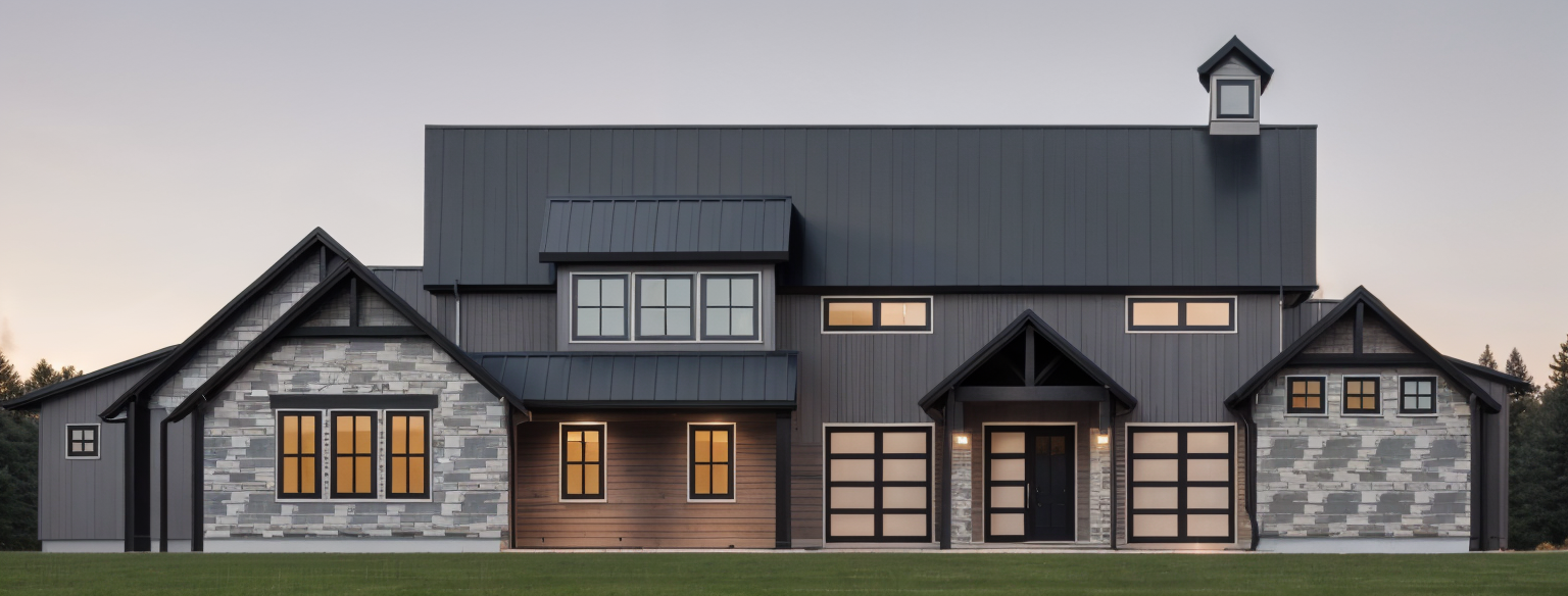 modernist exterior shot modern farmhouse with black steel roof dark gray siding gray and white stone and brown wood accents architecture