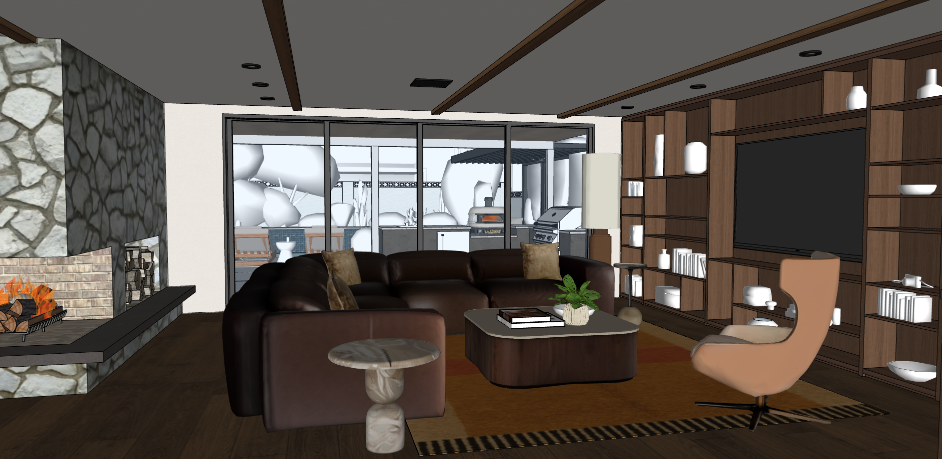plaintext render a mad men inspired den living room featuring a luxurious dark brown leather sectional sofa and a sleek coffee table with a marble accent the room has a warm cozy atmosphere with a stone fireplace on the left showcasing a lively fire with glowing orange and red flames the wall features floor to ceiling wooden shelves filled with books and mid century ceramic vases creating a rich brown contrast the ceiling has wooden beams adding a rustic touch the room overlooks a patio through large glass doors hinting at a serene outdoor space use ambient lighting to enhance the serene and warm ambiance with dark wooden floors complementing the overall palette