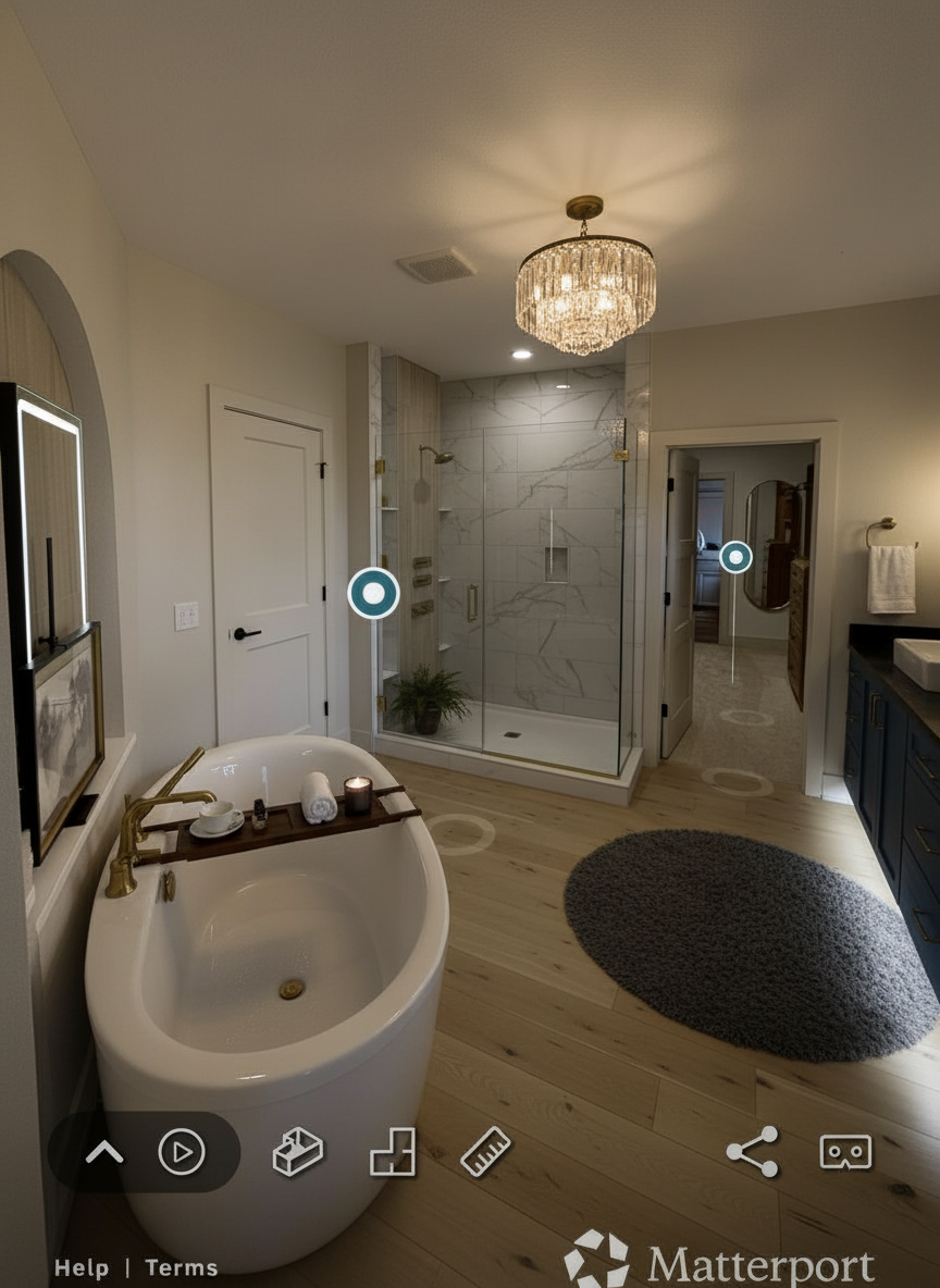 wide plank european white oak iron ore cabinets full tile accent wall behind tub change chandelier