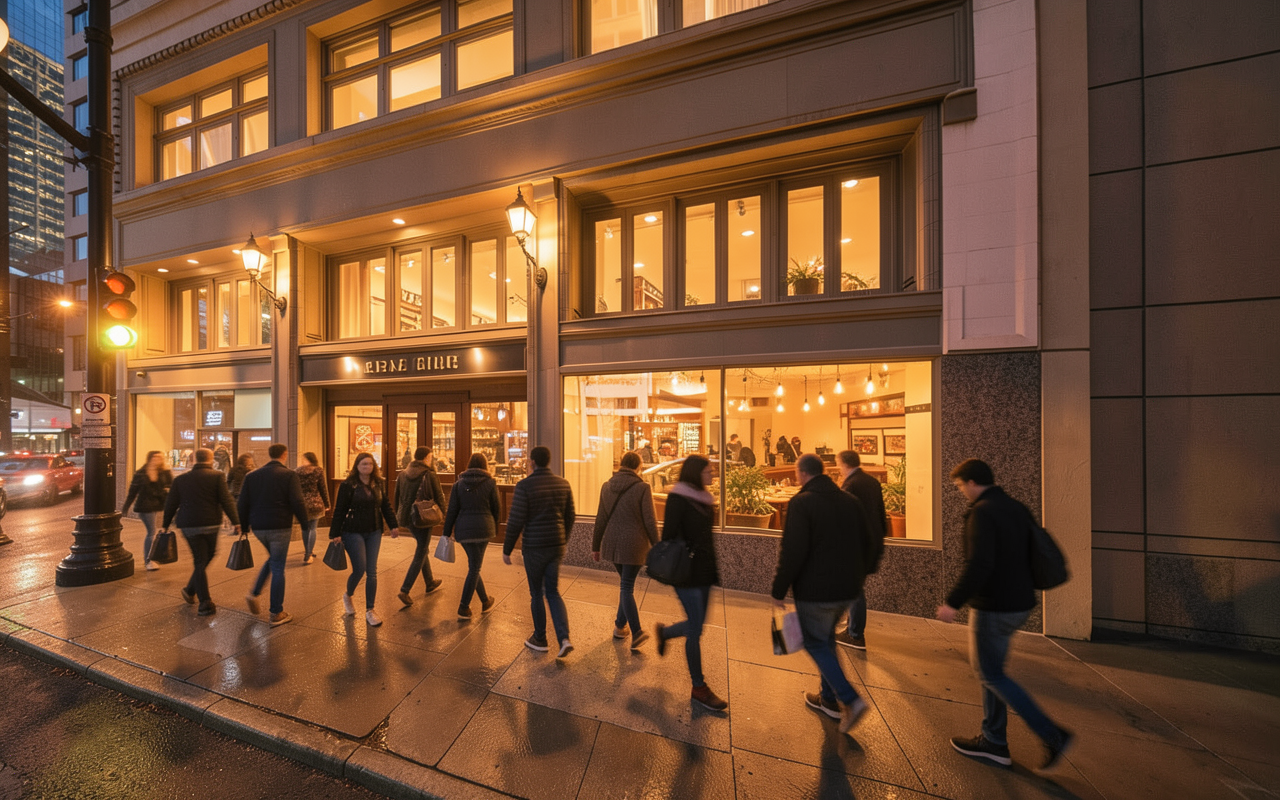 warm lighting evening at rush hour people going home from work storefront is a restaurant the building has all the lights on