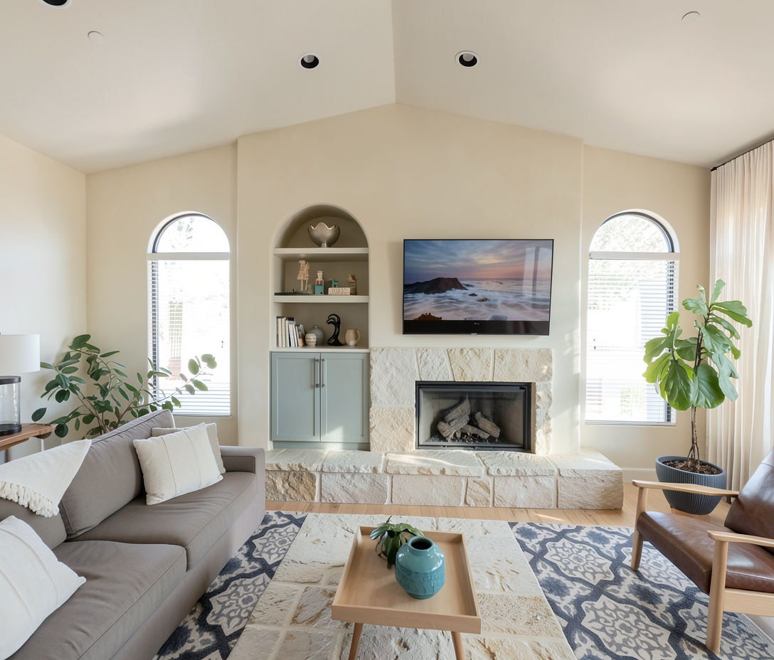 replace the hearth with light natural stone that is consistent in color with not much variation remove the fireplace surround and just have a larger fireplace opening no surround around the fireplace add a taupe limewash to the whole bumped out section of the wall replace the cabinet doors with a more modern look arch the bookcase