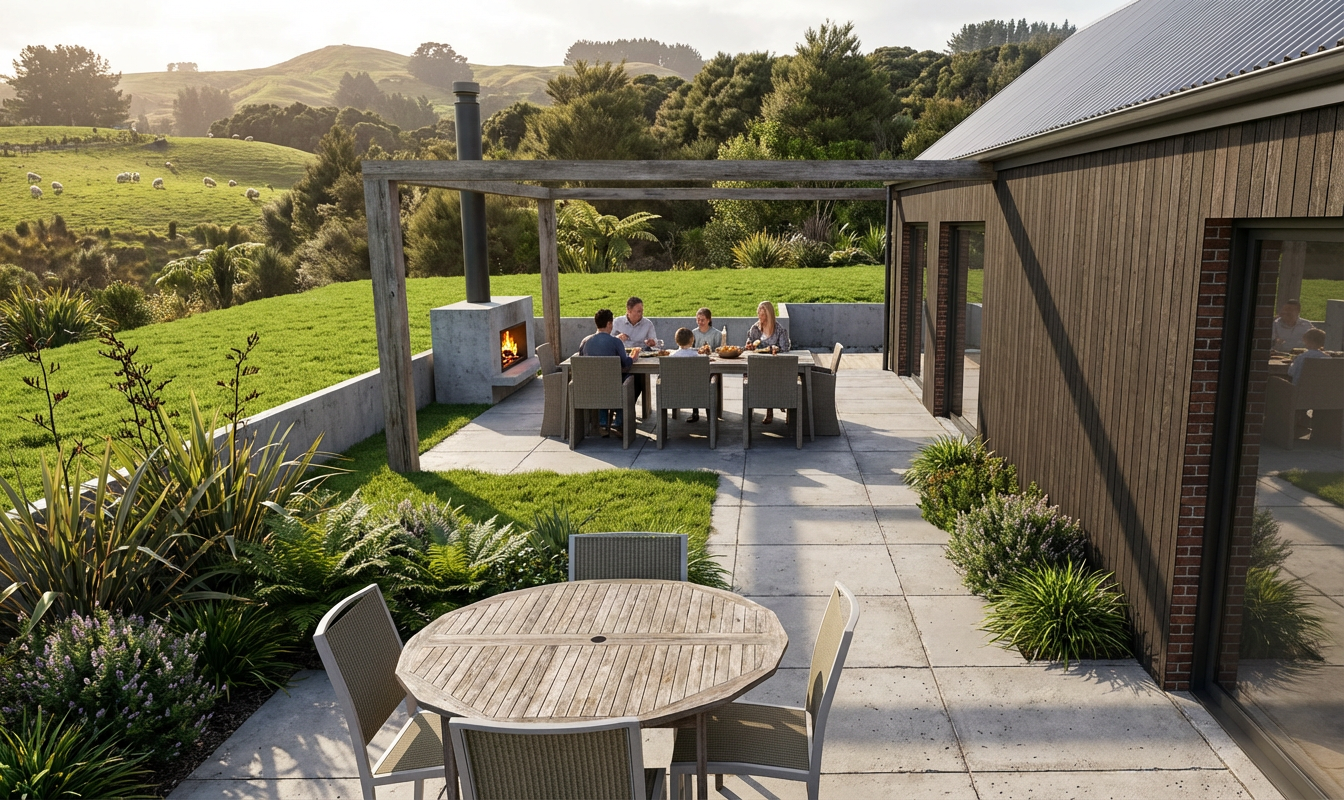 a craftsman style residential home south facing front elevation photorealistic exterior rendering golden hour natural lighting two story structure with a steeply pitched gable roof 12 3 pitch at upper dormer 12 11 pitch at main roof clad in horizontal nickel gap shiplap wood siding painted gable ends and dormer faces feature vertical tongue and groove wood siding stained natural wood tone composite rake boards and fascia trim all painted white the right side of the house is set back three feet from the left side of the house with the front entrance and porch and the porch off the right side of the house is set back 19 feet a covered front porch spans the entire front left facade suspended by a low slope metal awning supported by exposed 1 2 steel rods anchored to the siding porch decking is stained 5 4x6 clear pressure treated wood boards entry is a set of double french doors centered on the facade wide front steps descend from the porch across the full width of the left facade down to grade level as well off the left of the porch towards the driveway a concrete walkway extends from the base of the front steps directly toward the camera leading the eye into the composition to the left of the home a concrete driveway runs alongside the house toward the rear a raised side deck extends to the right with stainless steel cable railing a painted 2x6 top rail and matching stained deck boards foundation is screened with painted horizontal 1x6 boards with gaps a parged cmu address marker sits at the front entry a parged cmu planter with a concrete cap anchors the far right corner planted with trailing succulents spilling over the edge half round gutters at all eave lines landscaping is southern california native and drought tolerant clusters of blue oat grass and mexican feather grass sway softly in the foreground interspersed with agave aloe echeveria rosettes and low spreading ice plant decomposed granite and smooth river rock mulch ground the planting beds a grass lawn anchors the front of the yard the concrete walkway is flanked by grass lawn the overall landscape feel is warm dry textural and california coastal sun bleached and effortlessly curated warm late afternoon sunlight long soft shadows rich golden tones inviting curb appeal