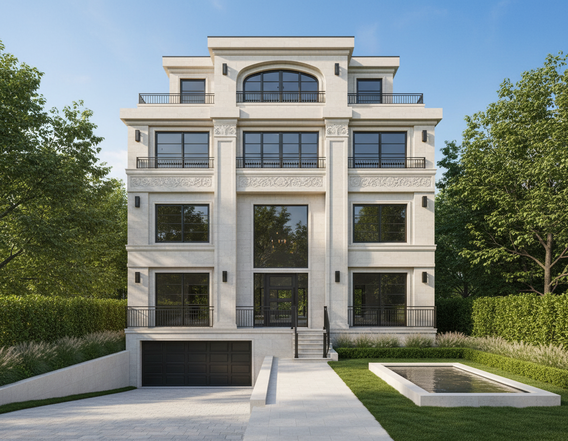 ultra realistic architectural exterior render of a modern residential house the fa ade is made of camargue carrera facing bricks from heylen ceramics with realistic texture subtle color variation and natural mortar joints directly above the windows the fa ade bricks are laid in a rotated bond with the bricks oriented vertically instead of horizontally clearly visible and accurately detailed aluminium window frames in supranodic collection bronze with realistic reflections and glass natural landscape surroundings neutral environment soft daylight realistic shadows photorealistic high detail architectural visualization