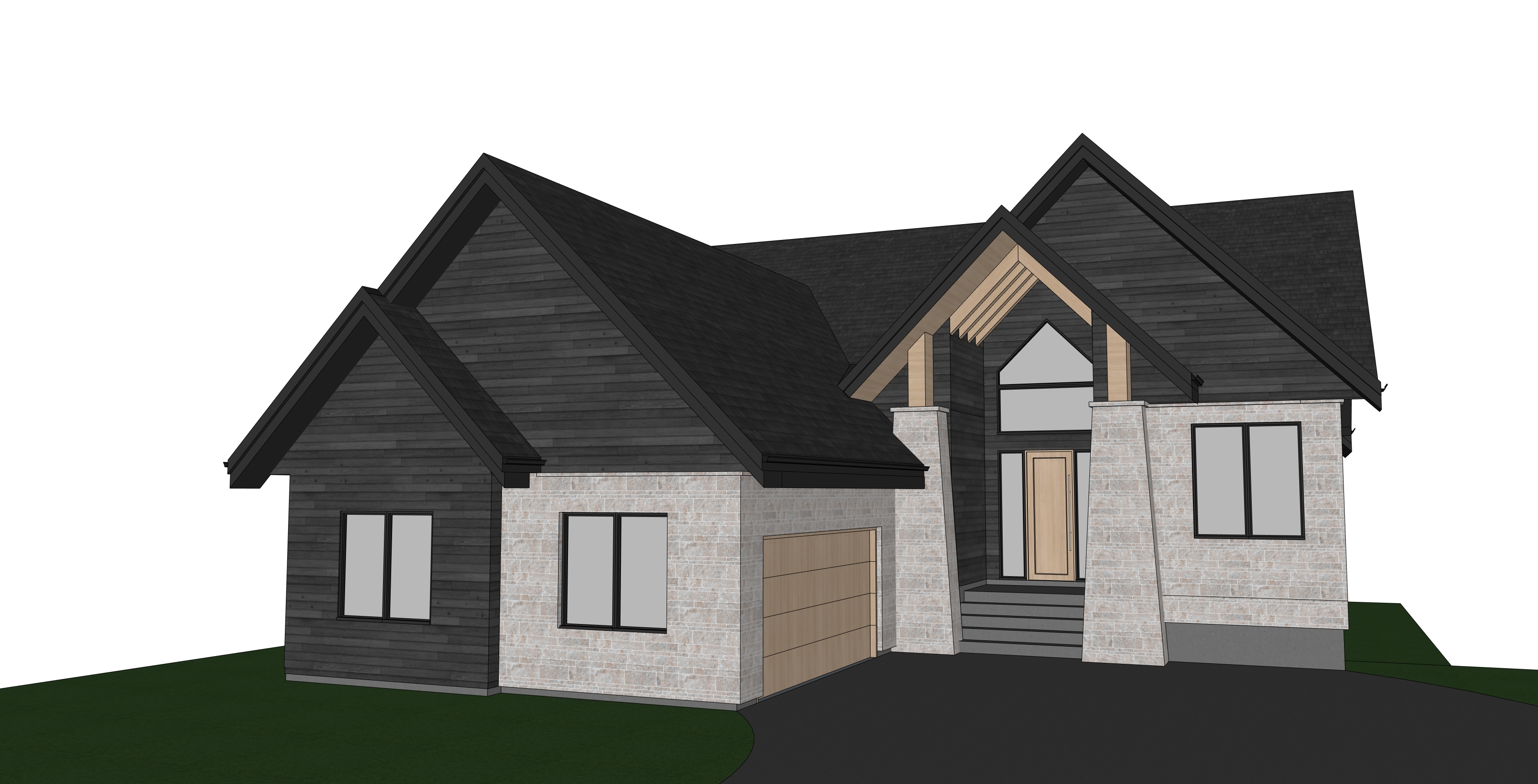this walkout home is in a housing development in winnipeg manitoba and there is a retaining pond small lake in the background other medium to large walkout homes will be visible across the lake in the backyard some tasteful restrained landscaping with low flowers and shrubs and bushes