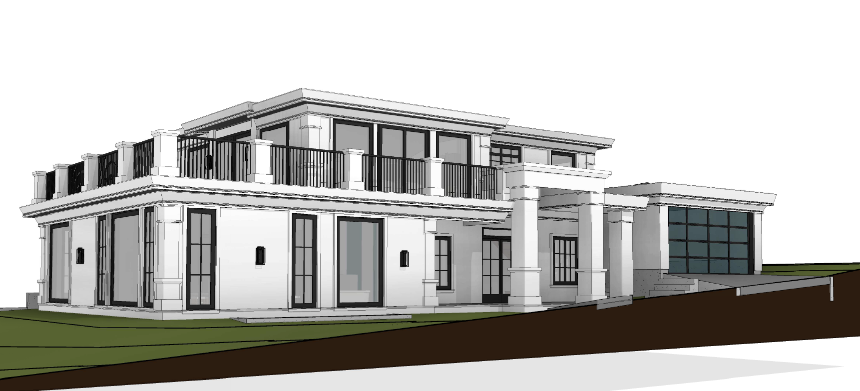 render a modern duplex house with a sleek and elegant design the exterior features a mix of dark charcoal and natural wood accents creating a striking contrast the garage doors and large windows have black frames blending harmoniously with the stone textured white limestone walls the roof is a deep slate complementing the overall color scheme the surrounding landscape is lush and green enhancing the contemporary aesthetic the atmosphere is serene and inviting with soft ambient lighting casting gentle shadows emphasizing the architectural details mountainous north vancouver setting manicured french style landscape with cedar hedges white hydrangea bushes and lots of roses