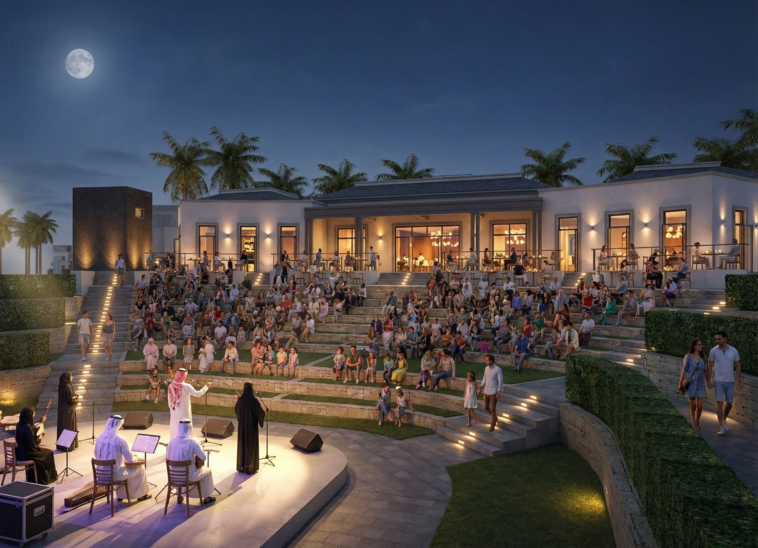 evening view with lights on inside the restaurant fill the amphitheater seating with people and kids dressed in casual resort clothes add some people walking up and down the amphitheater steps enhance the landscaping add some lighting on the stage in the foreground put some contemporary egyptian musicians men and woman performing on the stage with musical instruments and other performance equipment add spot lights on the stage performers add people sitting at tables on the top level of the theater next to the restaurant building with drinks on the tables watching the stage add a moon in the sky in the upper left corner of the view make the hedges more natural and realistic looking make the inside of the building look like a restaurant inside with mood lighting add step lights to the stairs in the amphitheater add a man and woman walking on the pathway at the lower right side of the view use the architecture in the reference image
